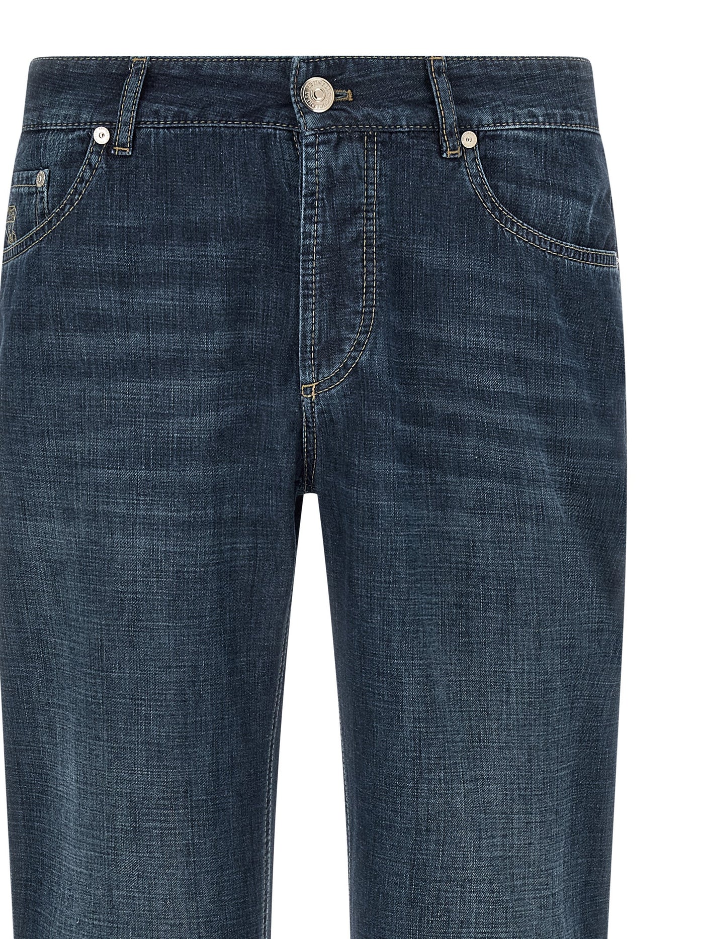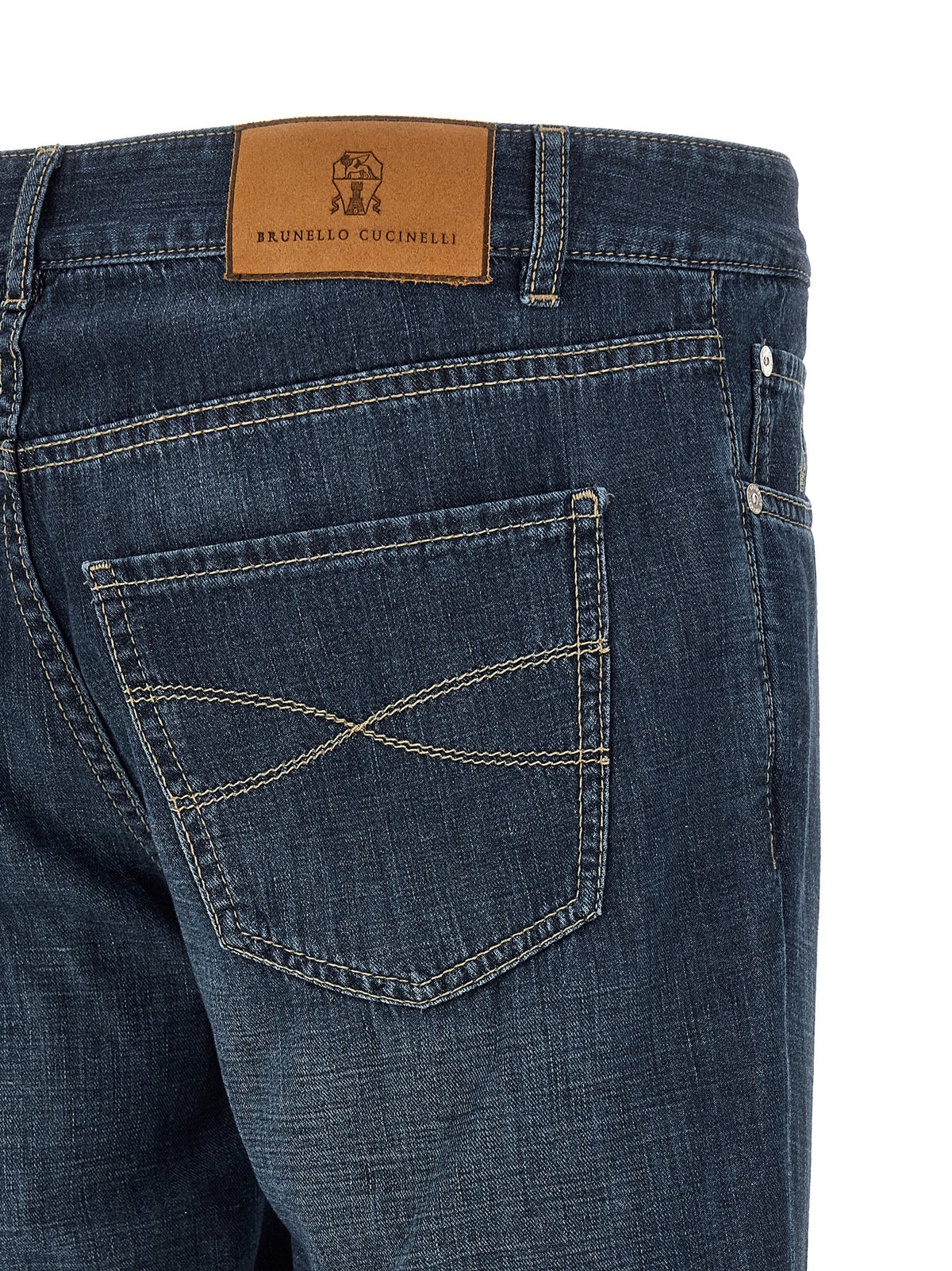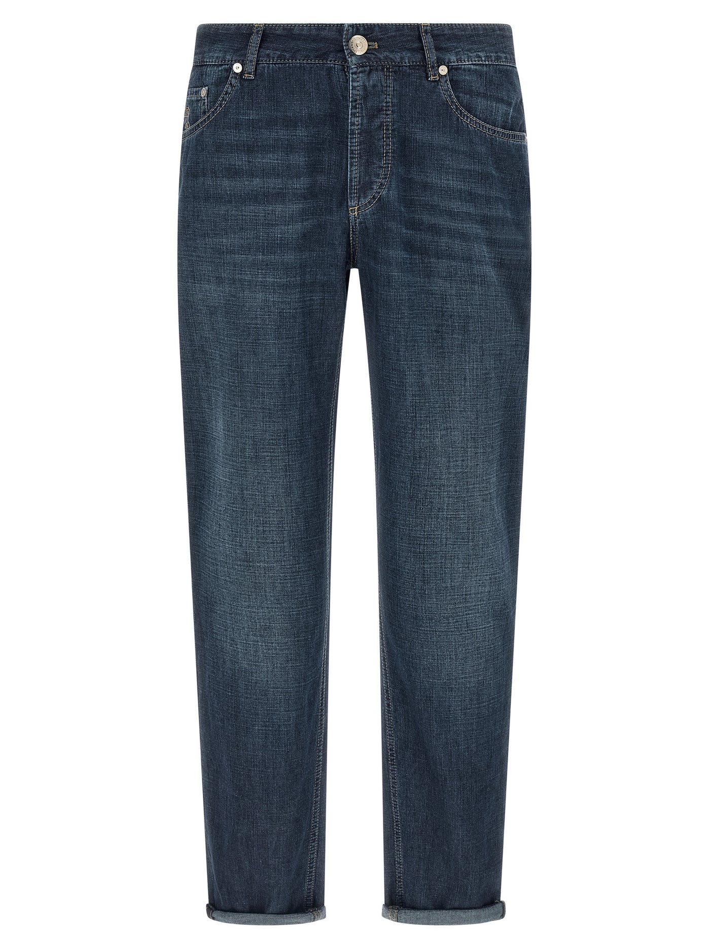 Jeans in fine 9.5 oz japanese denim with contrast stitching, Logo embroidery and front button closure, Five pockets, Back leather logo tag, Turn-up on the leg bottom. Size and Fit - traditional fit