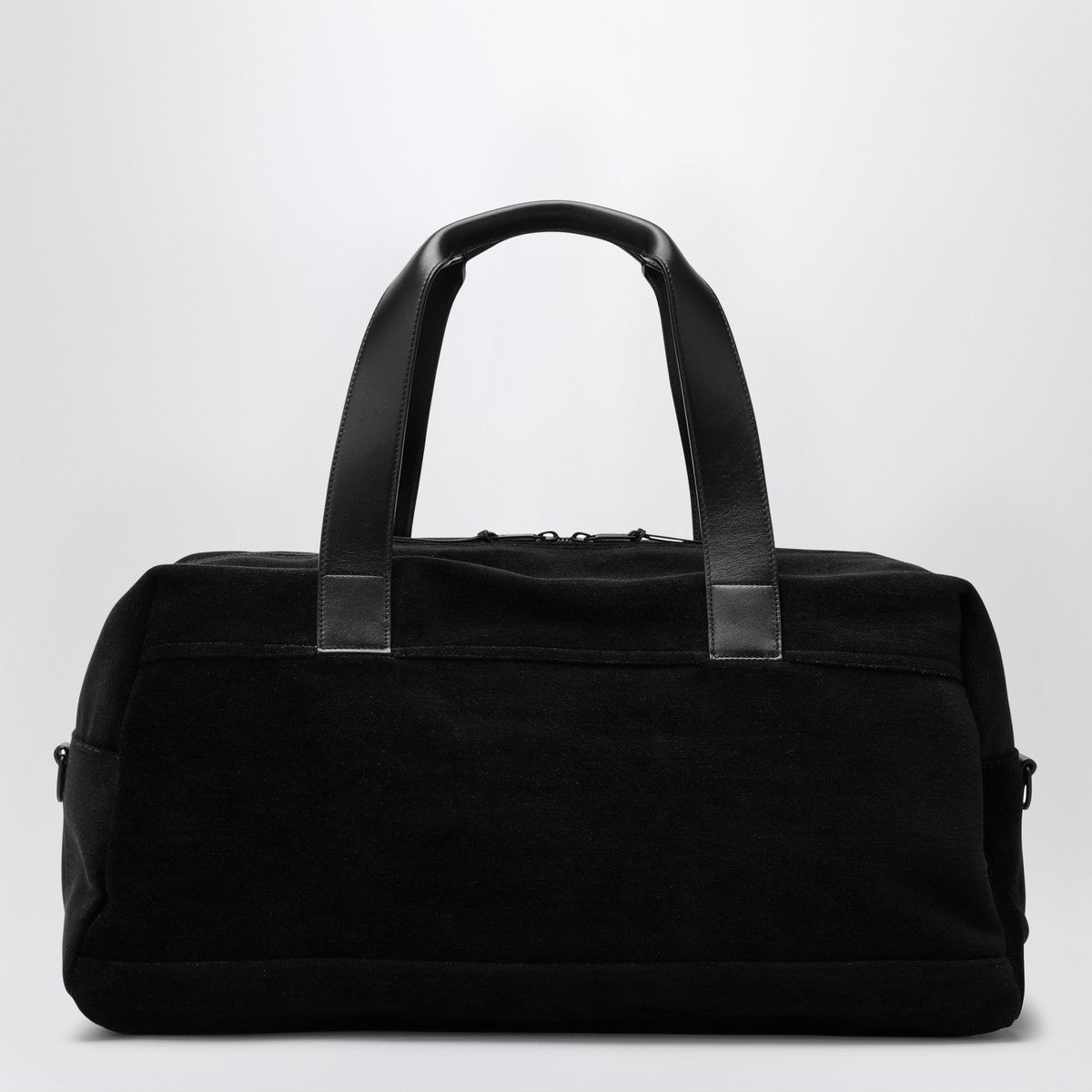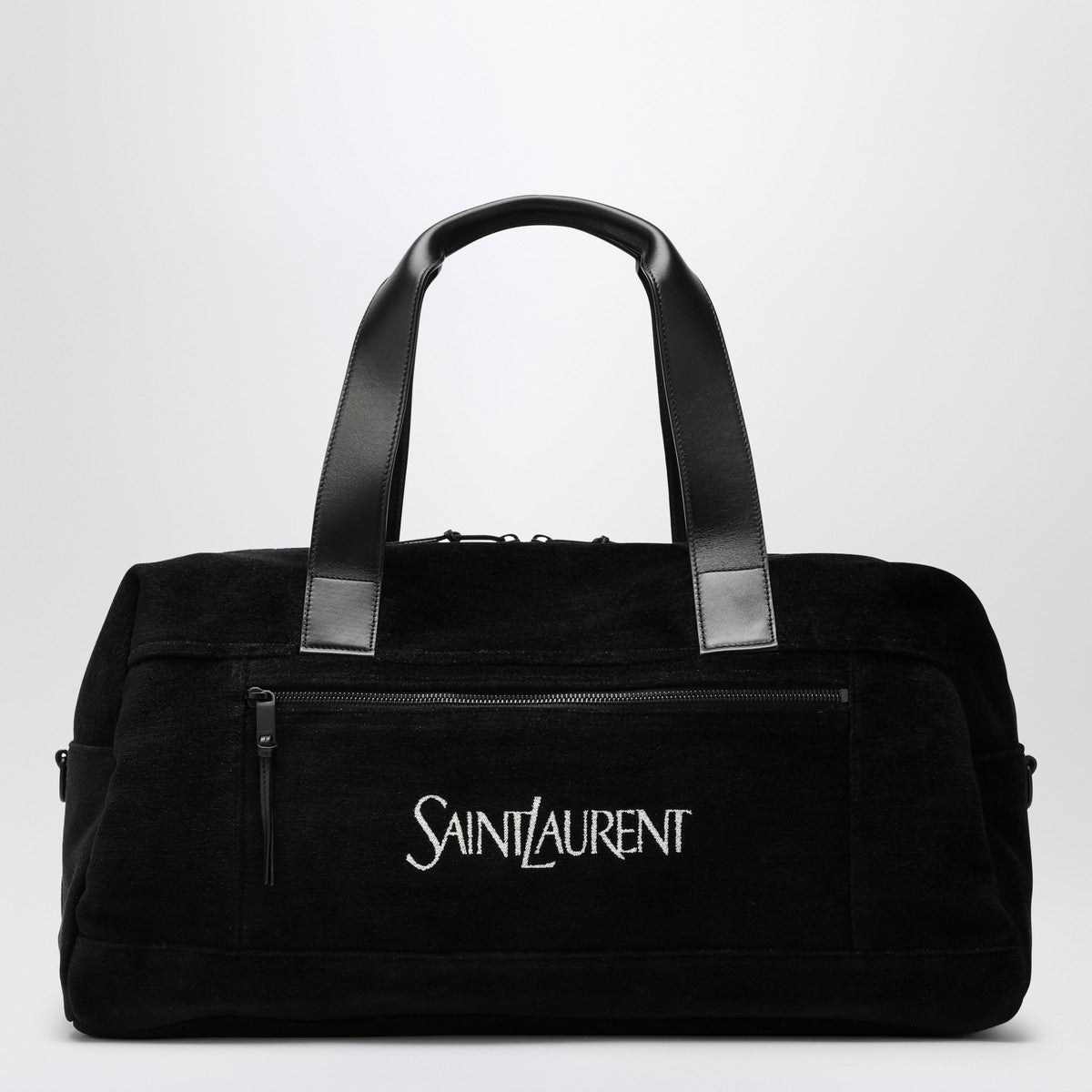 Duffel bag by Saint Laurent in black cotton, featuring contrasting logo embroidery on the front, adjustable and removable shoulder strap, two leather handles, zipped top closure, front zipped pocket, and one inside welt zipped pocket. Size and Fit - Width 50 cm x Height 24 cm x Depth 25 cm Adjustable shoulder strap length min 74 cm - max 140 cm Handle drop: 21 cm