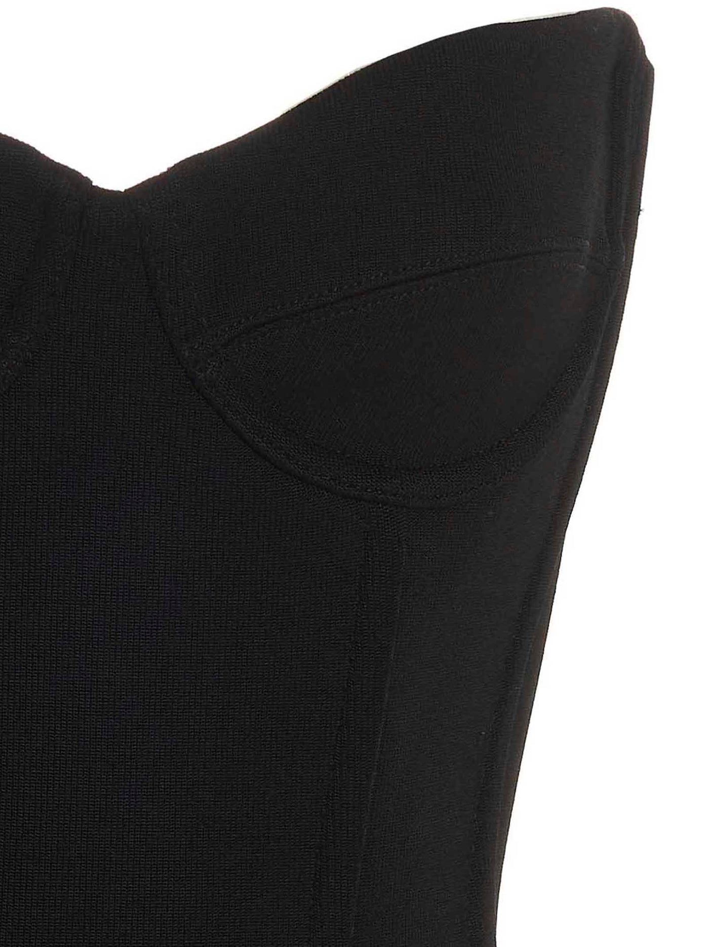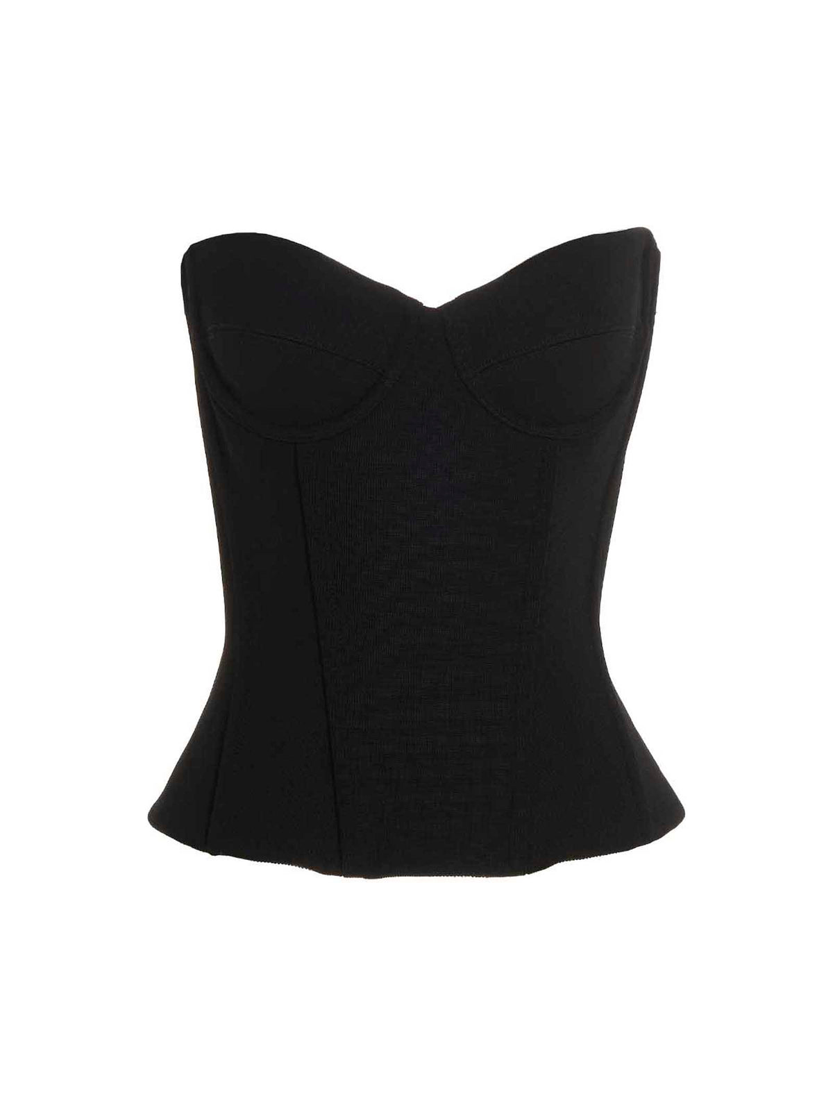 Elasticized jersey bustier top with off-the-shoulder cropped style with supporting splints and a back zip closure. Size and Fit - True to size fit French size