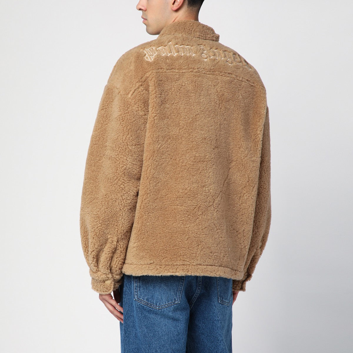 Shirt-jacket by Palm Angels in camel-coloured teddy, featuring a collar, front button placket, flap and button pockets on the chest, long sleeves, button cuffs and logo embroidery on the back. Size and Fit - Model wears size 48 IT Model measurements: Height: 185 cm Chest: 100 cm Waist: 83 cm Hips: 92 cm