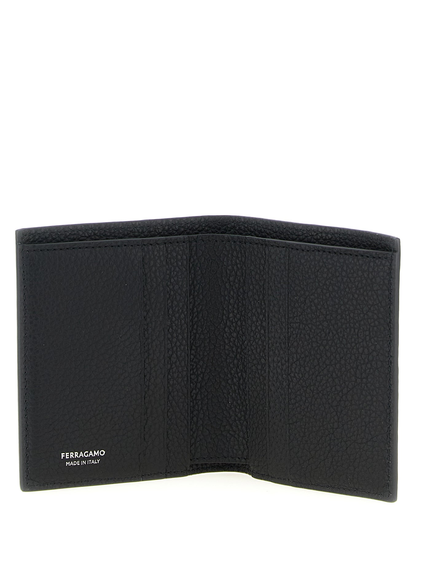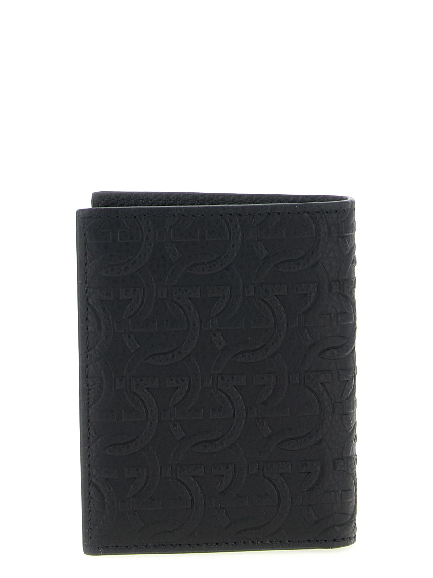 Hammered calf leather wallet with embossed embossed 'gancini' pattern, Metal 'gancini' logo on the front, And a book opening. Size and Fit - W 8.5 x H 10.5 cm