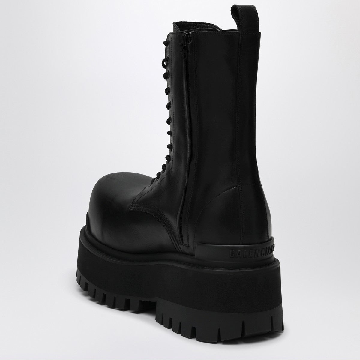 Black bull leather Balenciaga boots, characterized by an ultra-round toe, worn effect, 80 mm platform height, zip closure on the side, thick rubber sole with serrated edges featuring the BB logo on the front and a tab on the back.