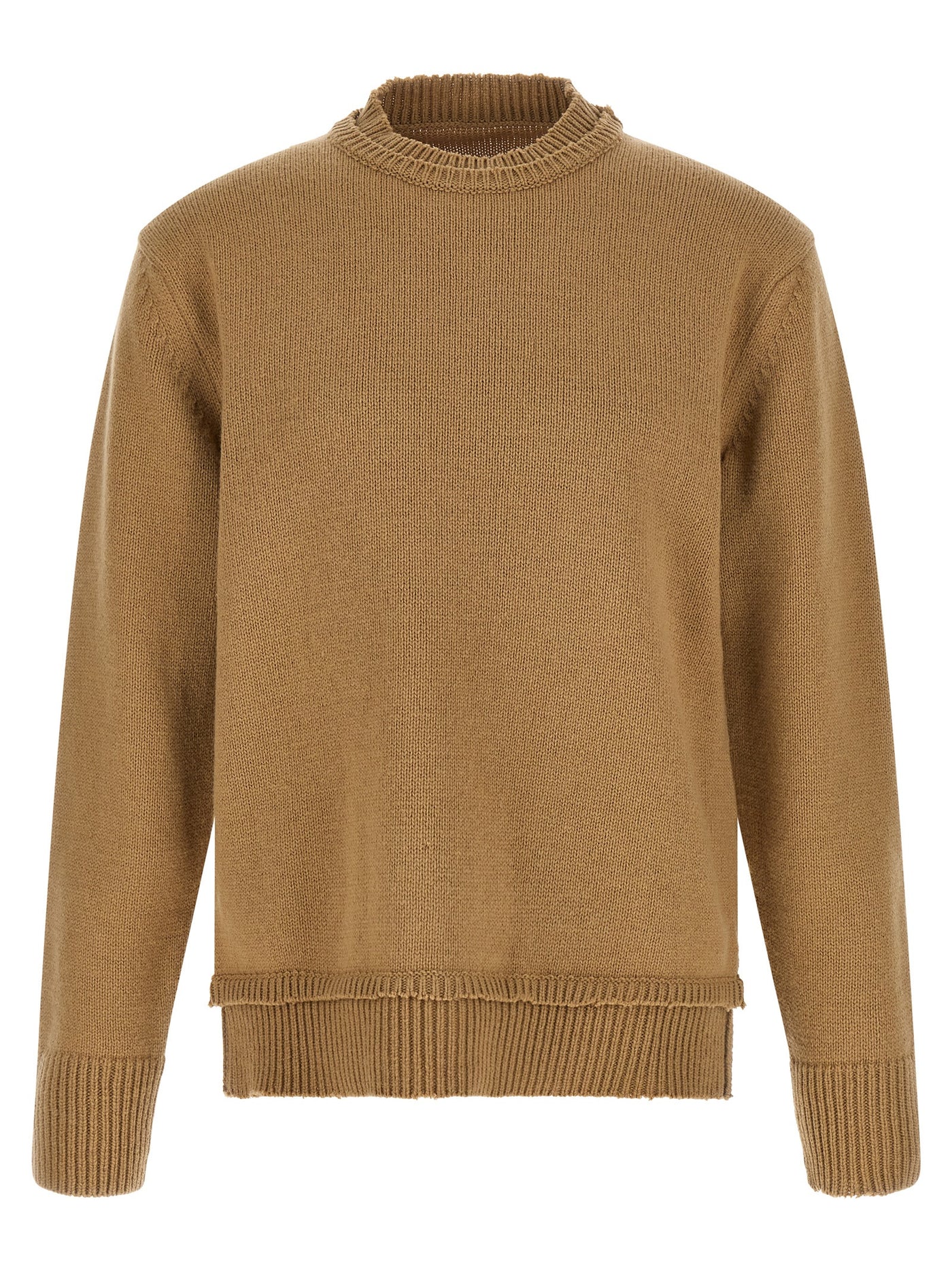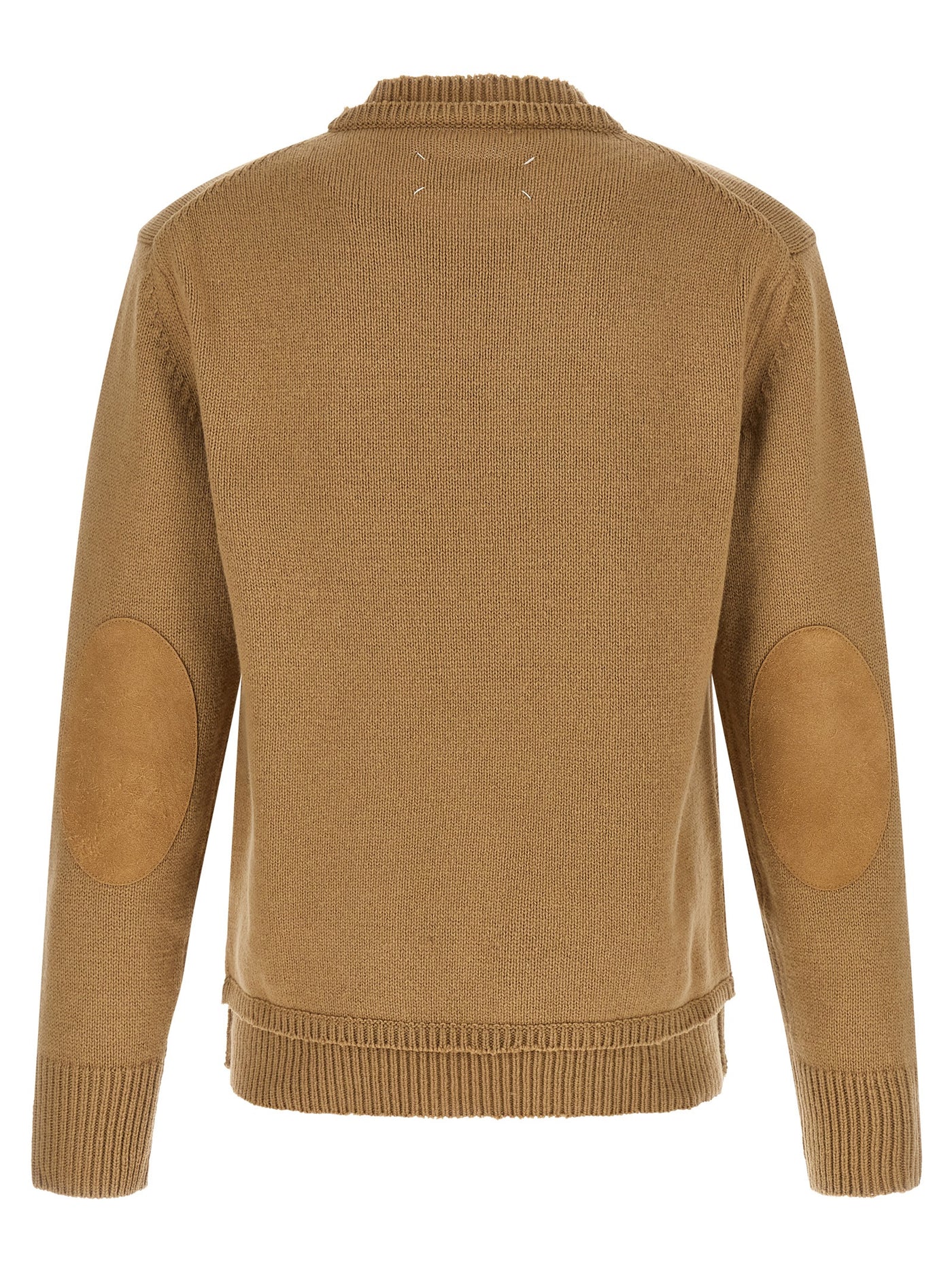 Thick knit wool sweater, crew neck, double layer effect, destroyed details, suede patches on the sleeves, long sleeves with cuffs. Size and Fit - Relaxed fit