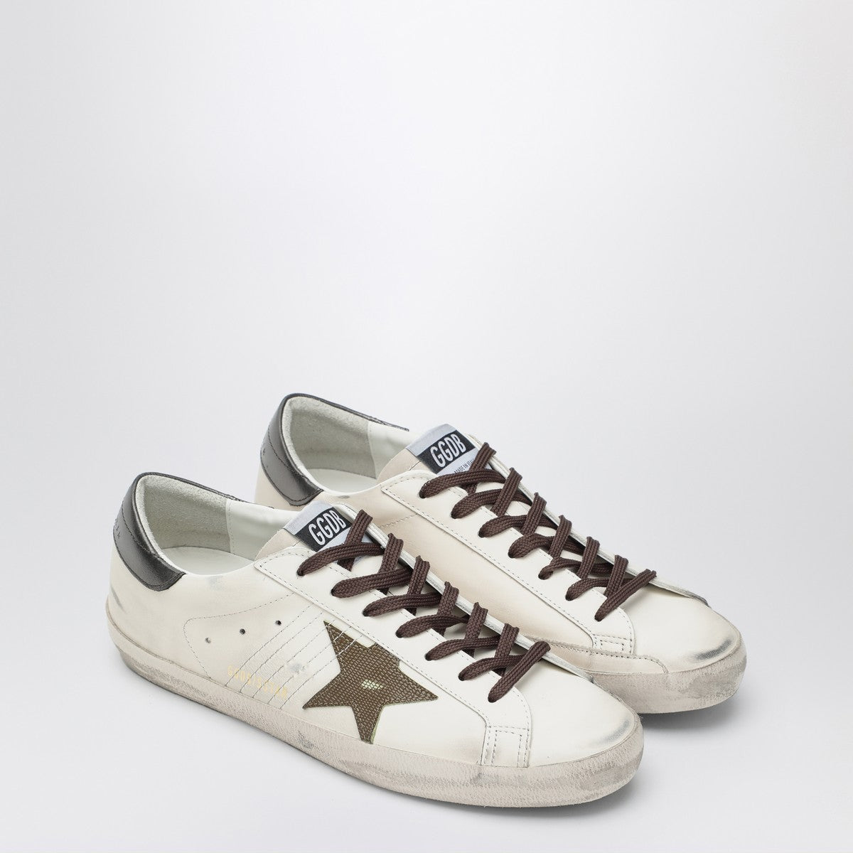 Golden Goose Deluxe Brand sneakers in white leather, featuring a round toe, lace-up closure, side star patch, vintage effect finish, anthracite grey heel with logo lettering, and rubber sole.