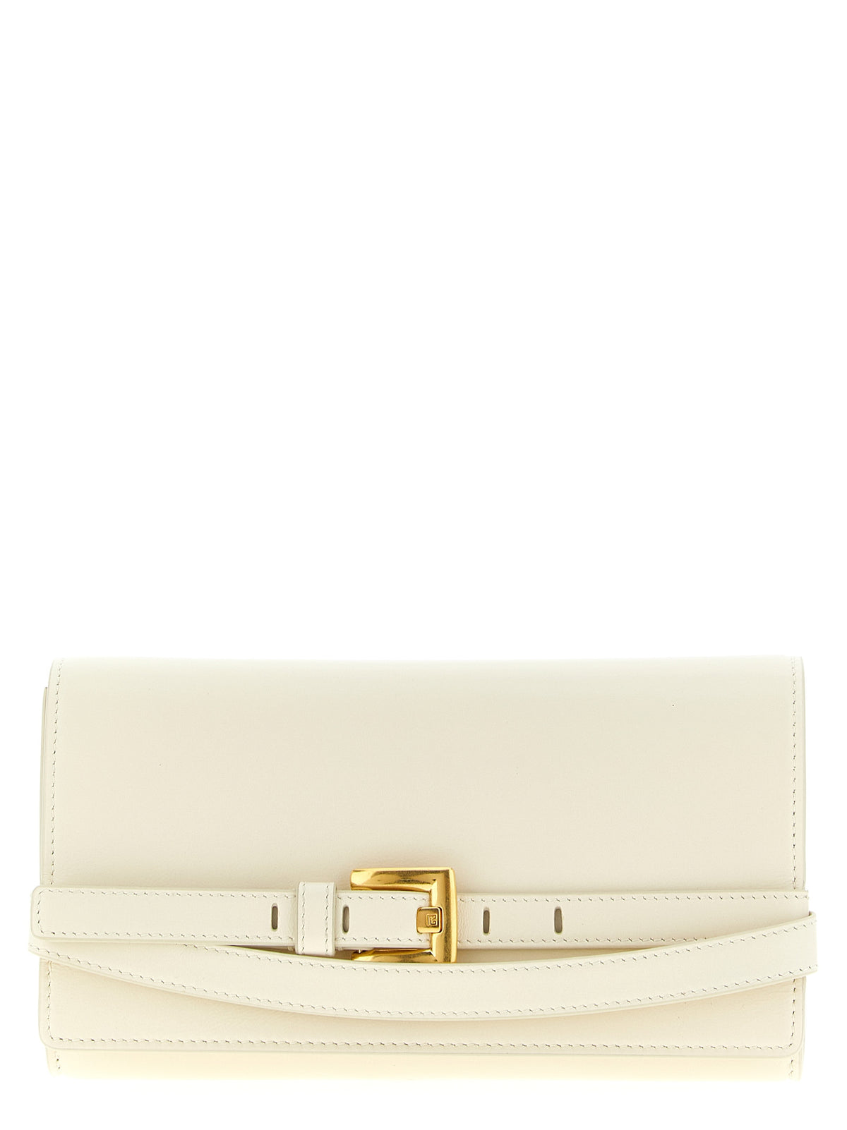'Shuffle' wallet on chain in wrinkled-effect leather, flap closure with snap button and front belt detail, chain shoulder strap with removable leather protection. Size and Fit - W 21 x H 12.5 x D 2.5 cm