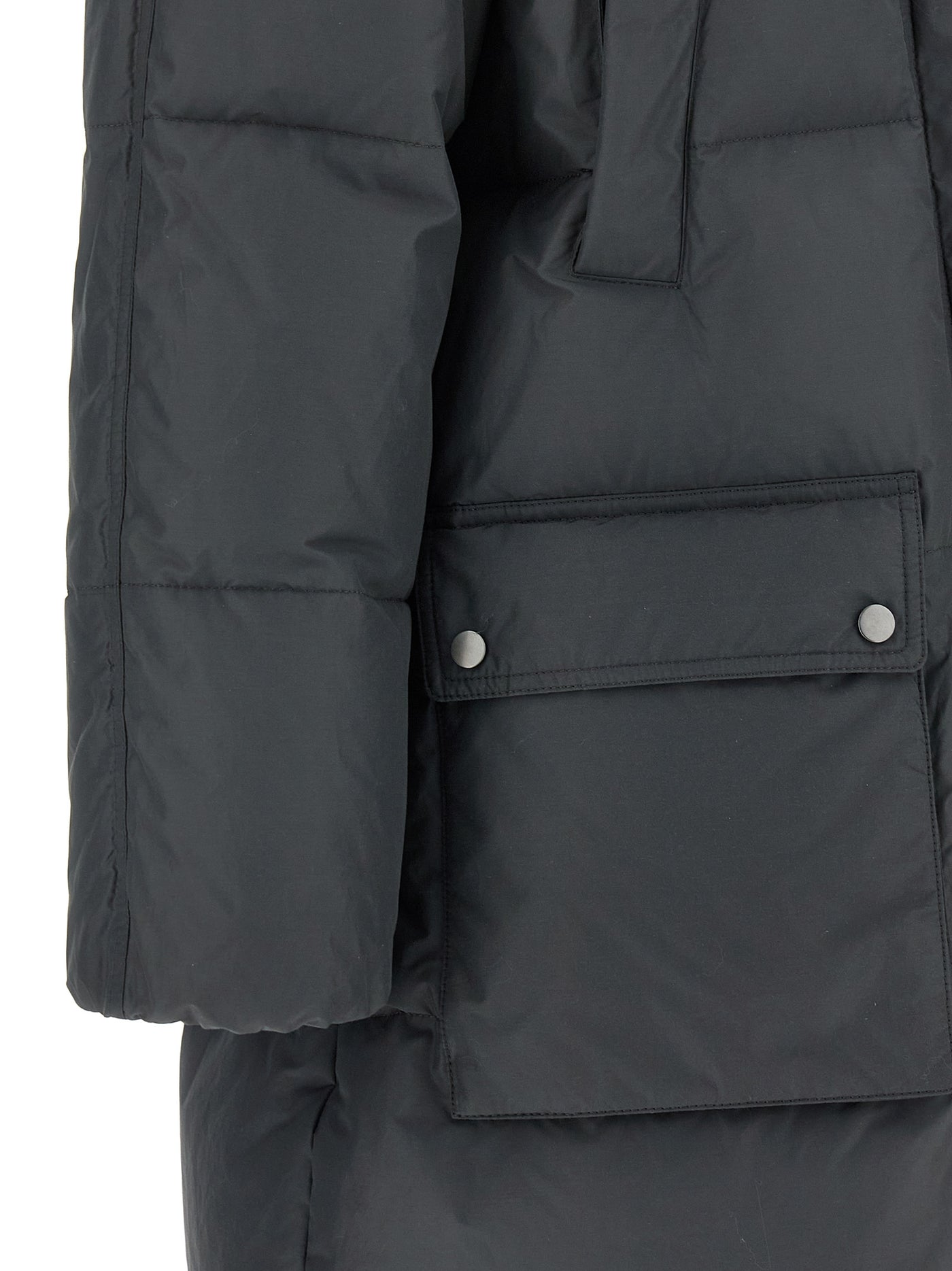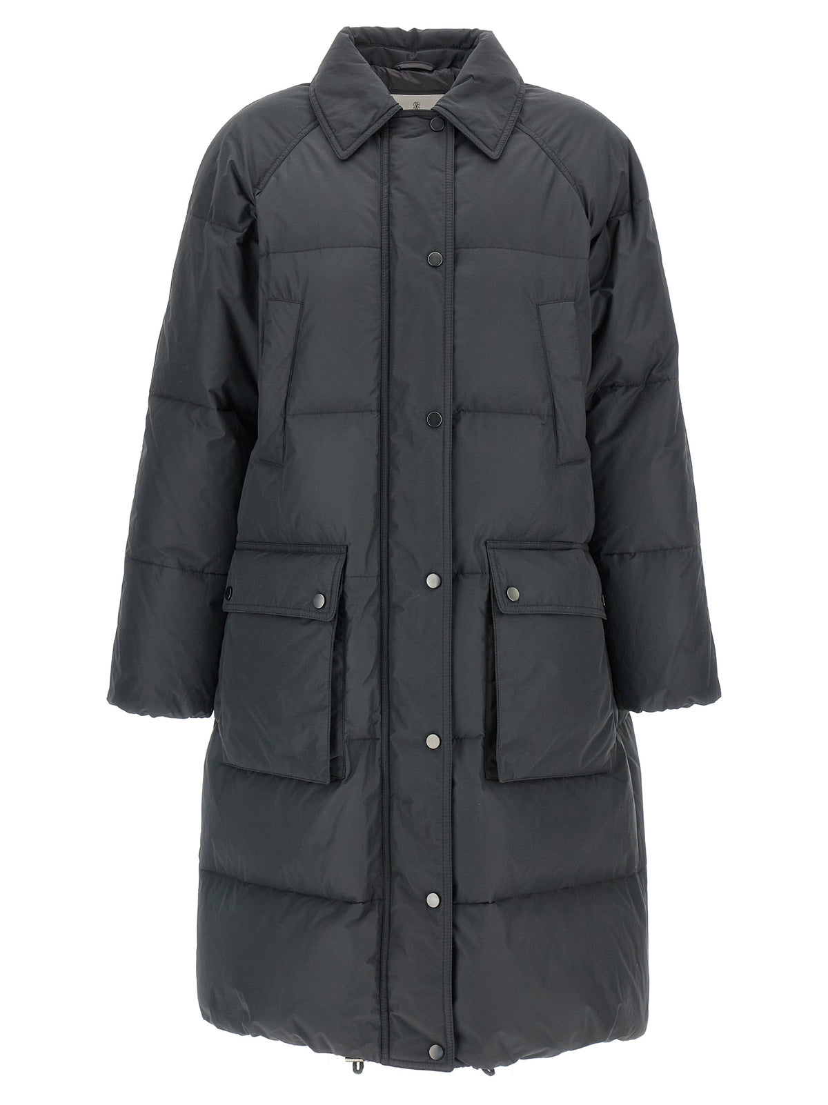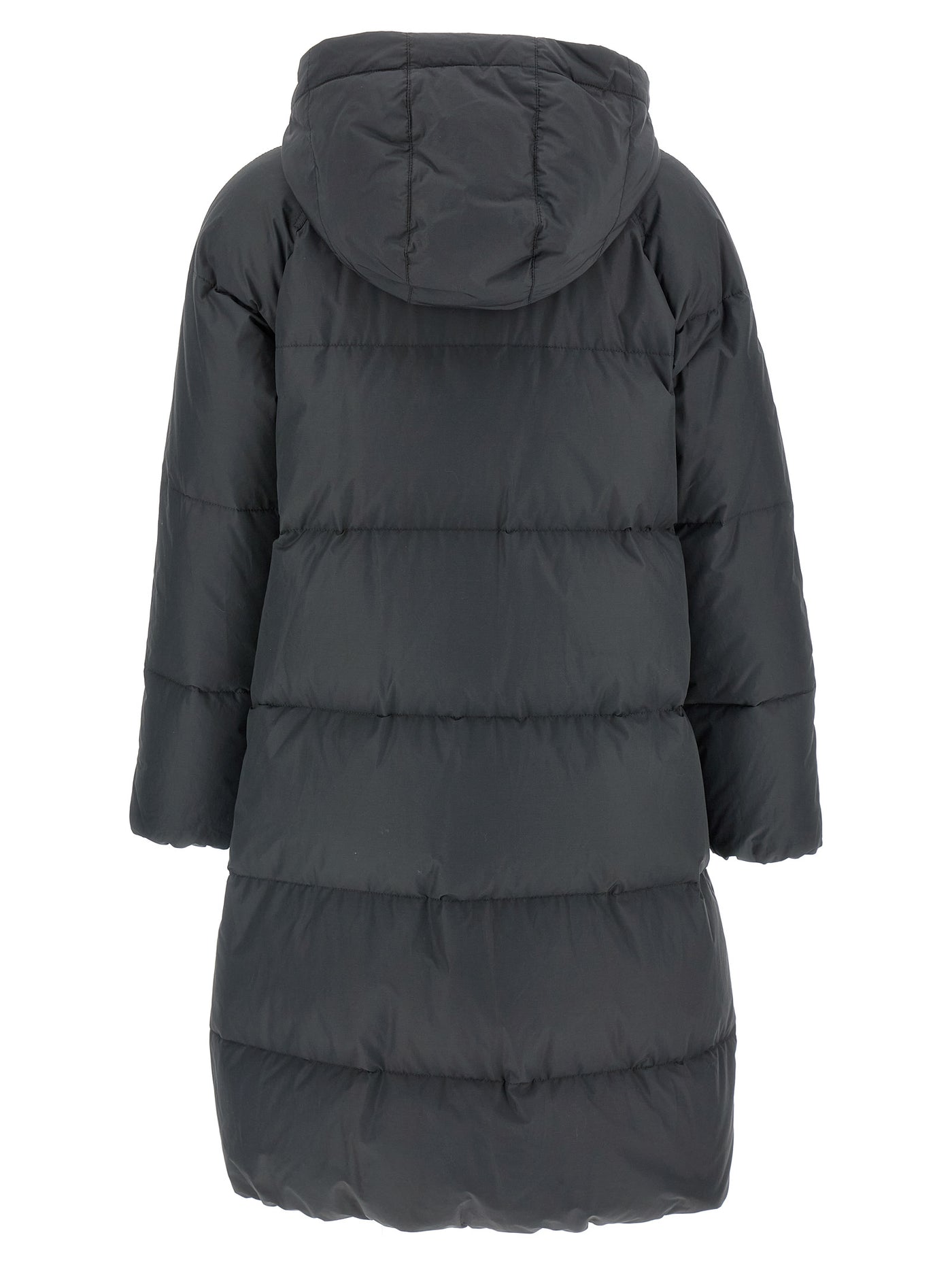 Long down jacket in quilted technical fabric padded with water-repellent goose down, removable hood, shirt collar, zip closure with 'Shiny Zipper Pull' monile zipper puller and front snap buttons, pockets, long sleeves with elastic cuffs, drawstring on the hem. Size and Fit - true to size fit