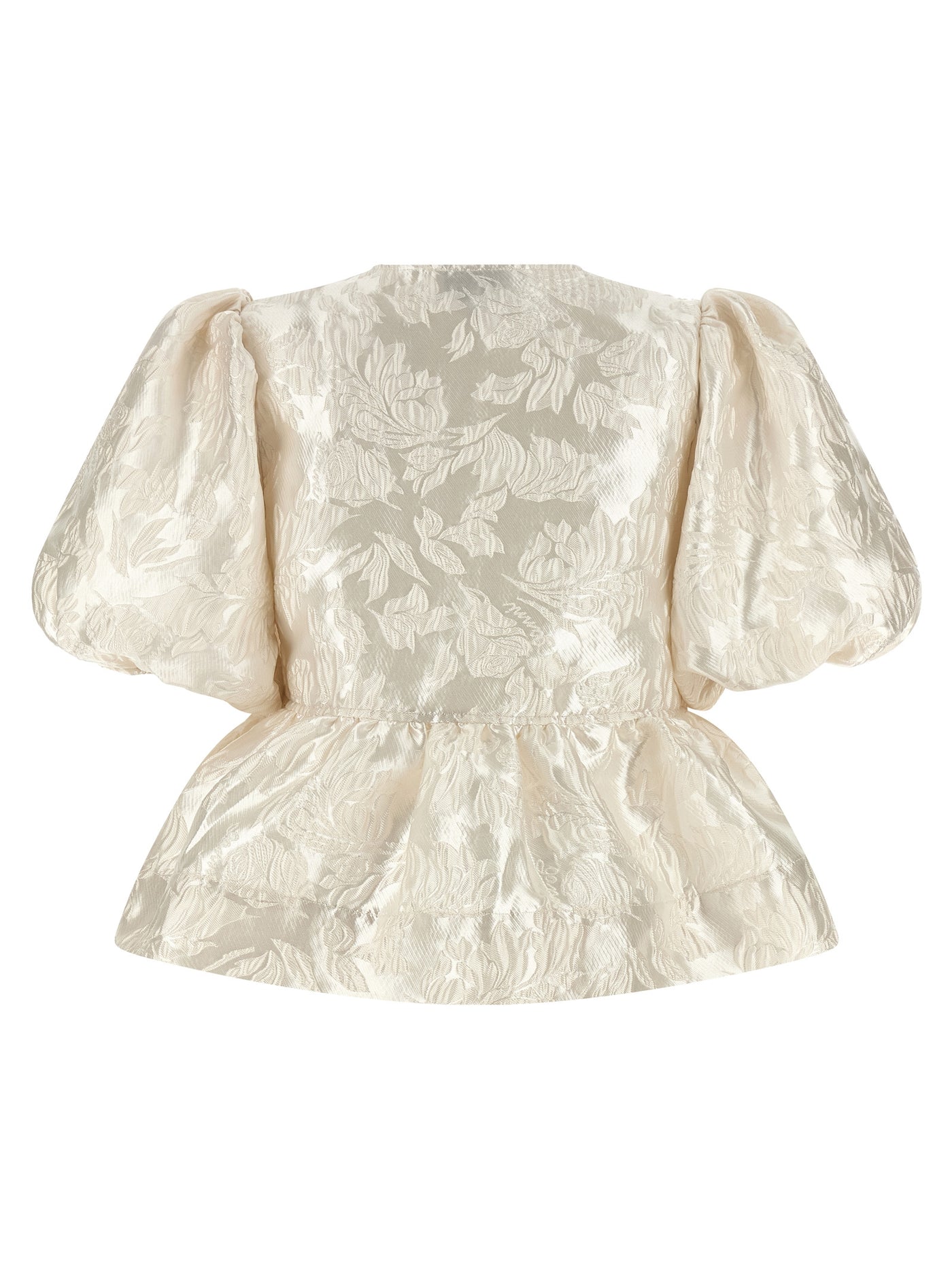'Satin Peplum' jacquard blouse with front lacing closure, crew neck, flounce waistband, short sleeves curled with elastic. Size and Fit - True to size fit