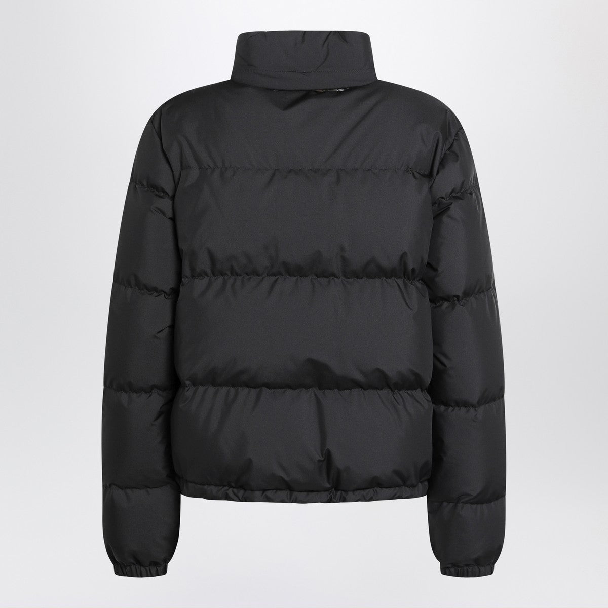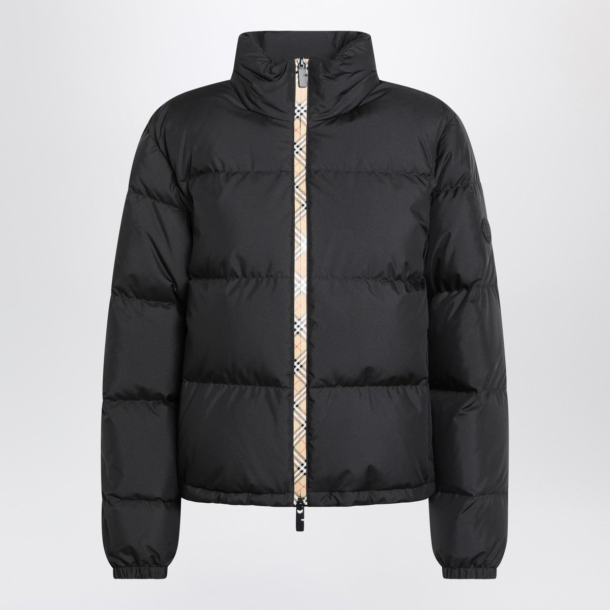 Black Burberry down jacket, characterized by a high collar, long sleeves with elastic cuffs, front zip closure with a beige detail featuring a Check pattern, two side welt pockets, and an elasticized hem. Size and Fit - Model wears size S Model measurements: Height: 178 cm Chest: 83 cm Waist: 63 cm Hips: 91 cm