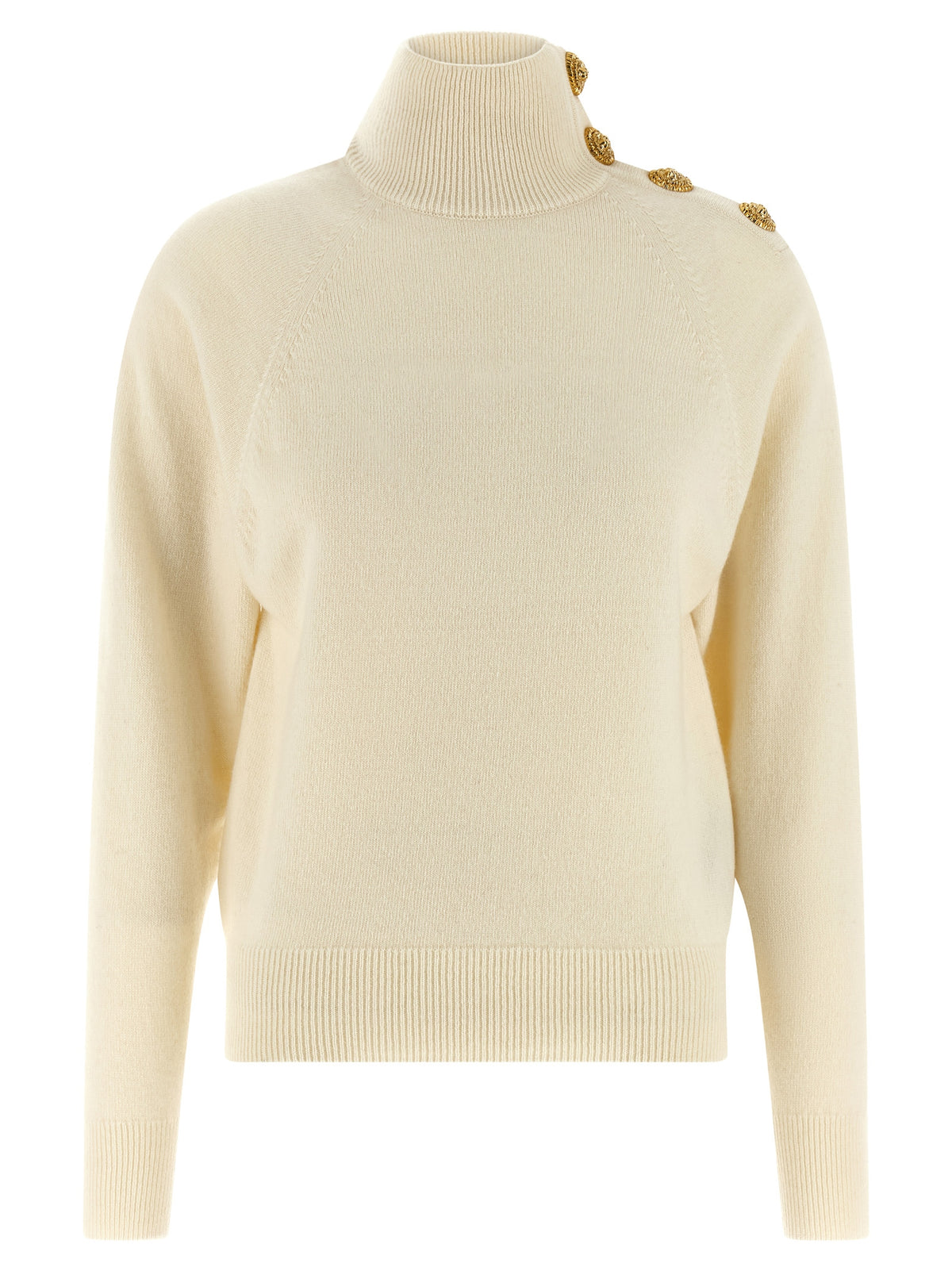 Wool and cashmere sweater with high neck, metal 'Testa di leone' button detail on the left shoulder, long bat sleeves with cuffs. Size and Fit - true to size fit - FRENCH size