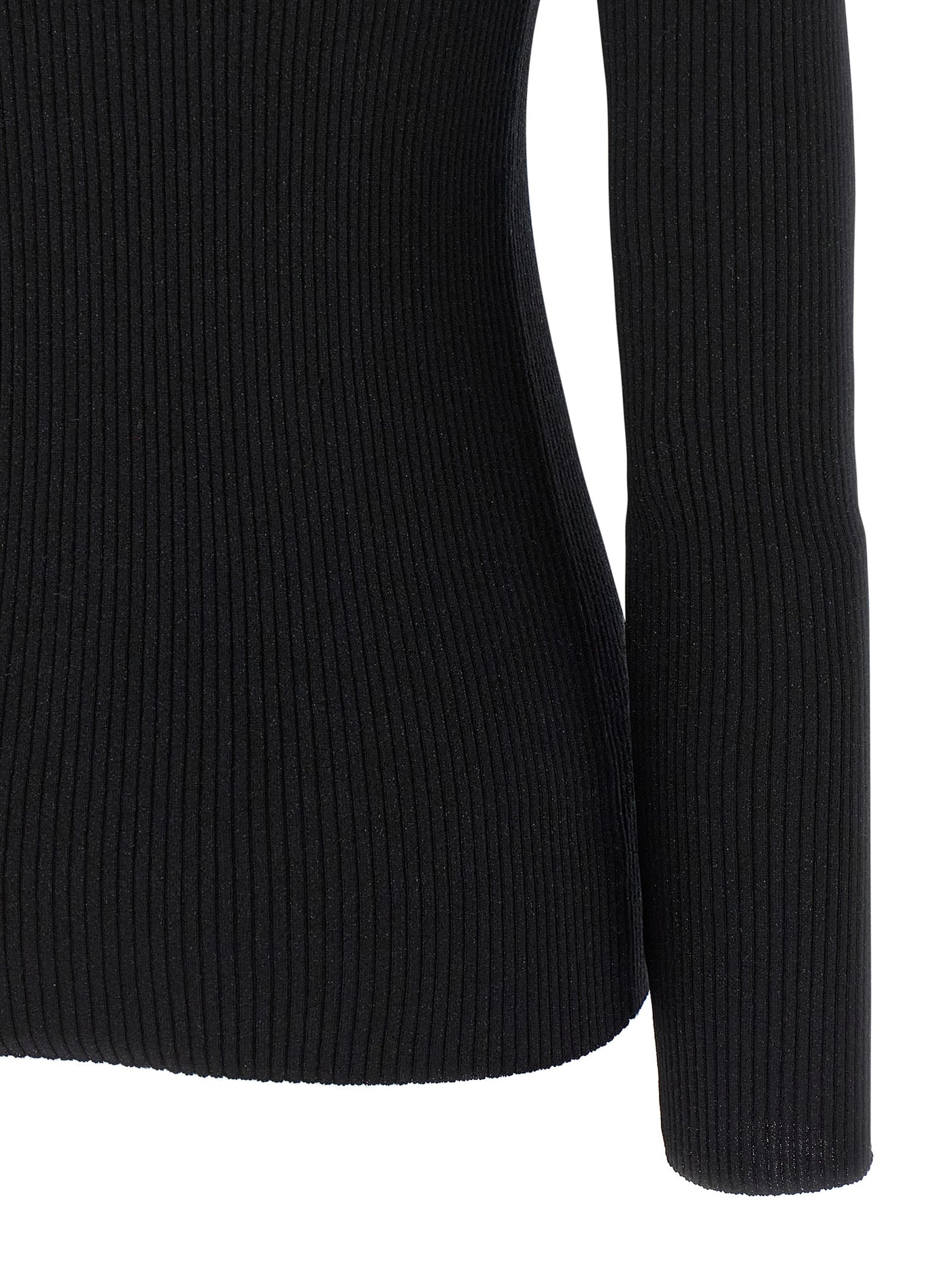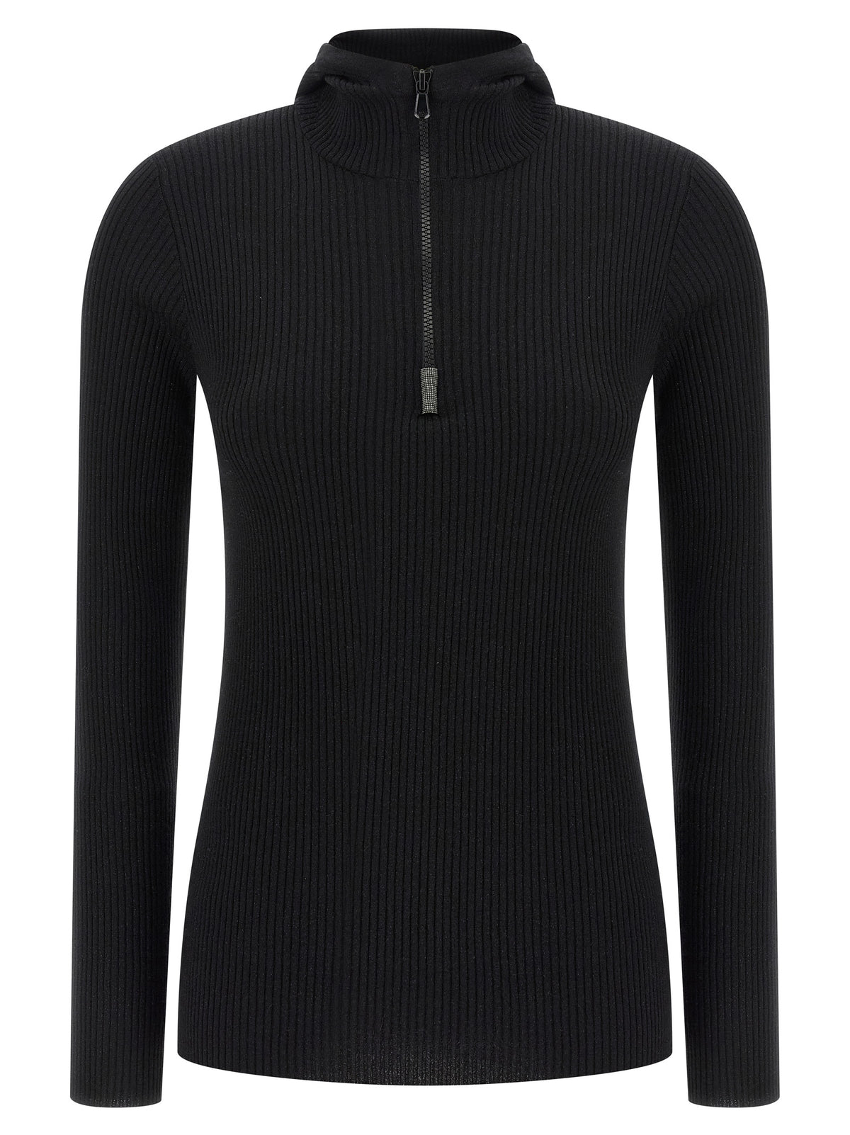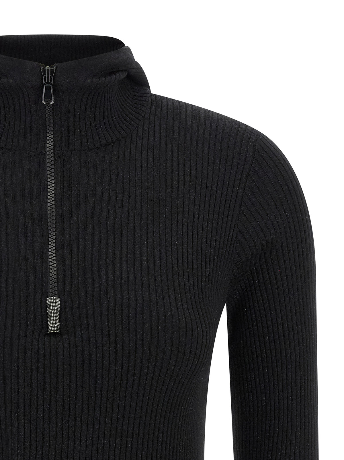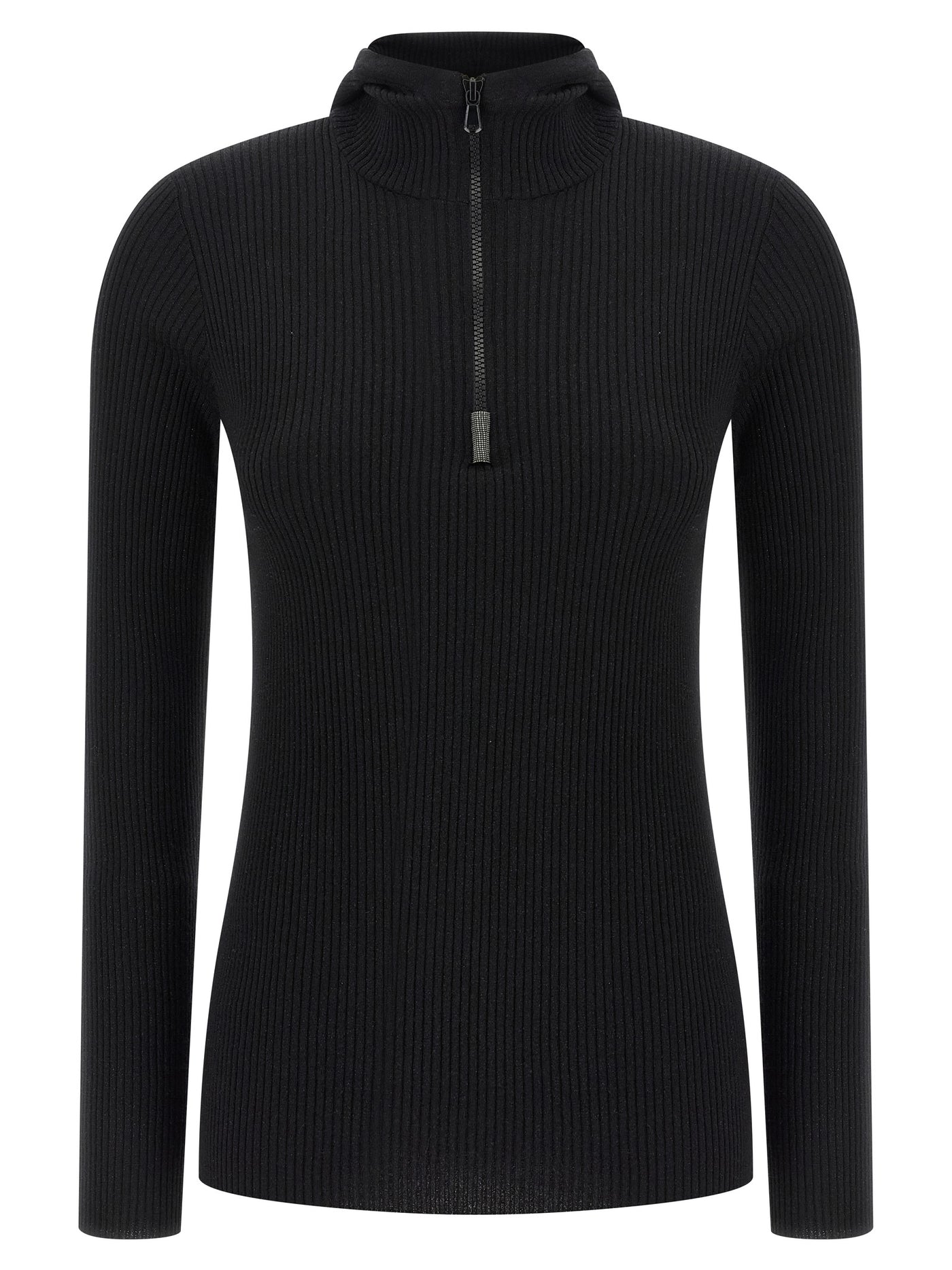 Ribbed cashmere and stretch silk blend hooded sweater with lamé thread, half zip with Monile detail, long sleeves and raw cut hem. Size and Fit - true to size fit