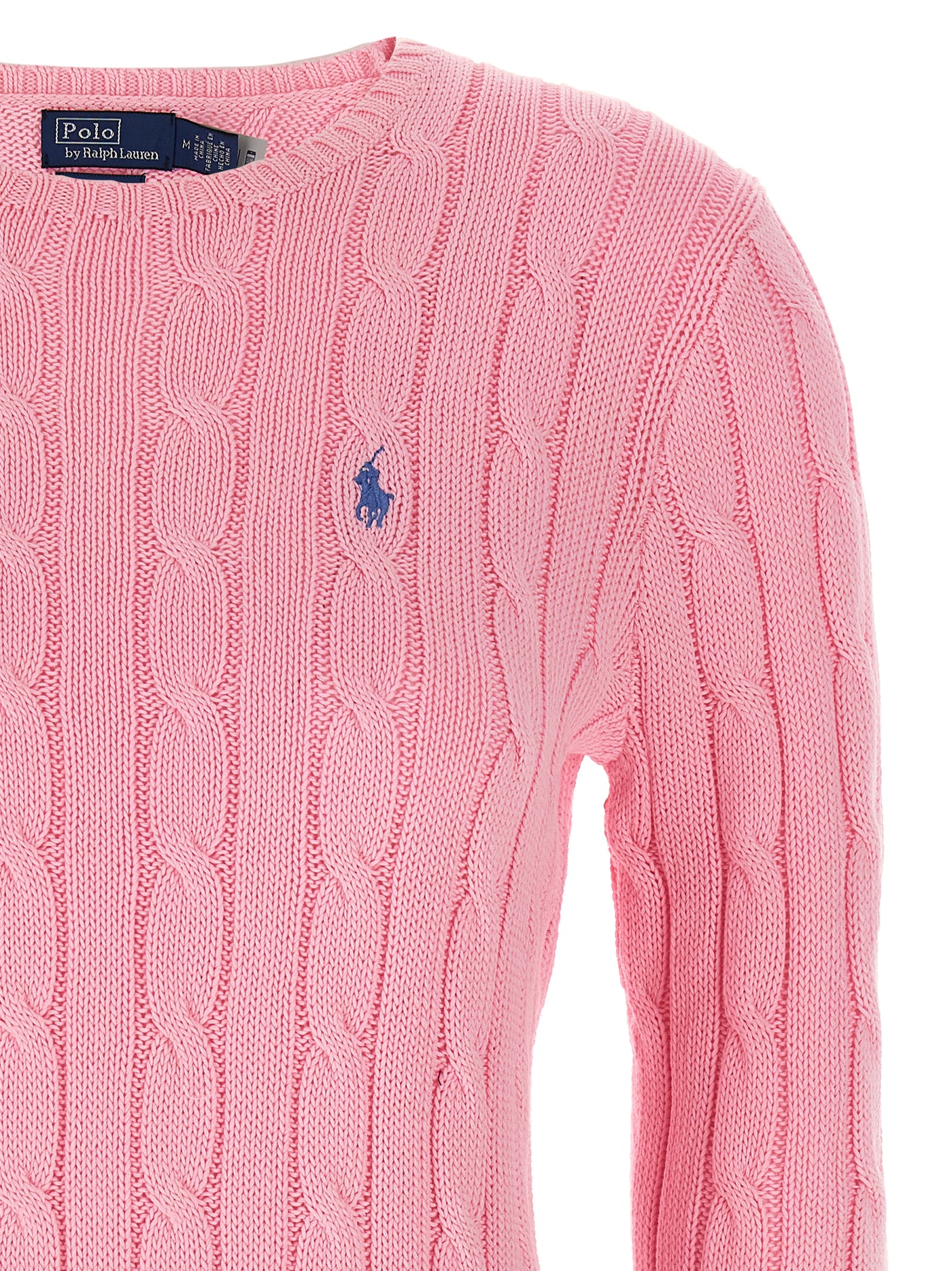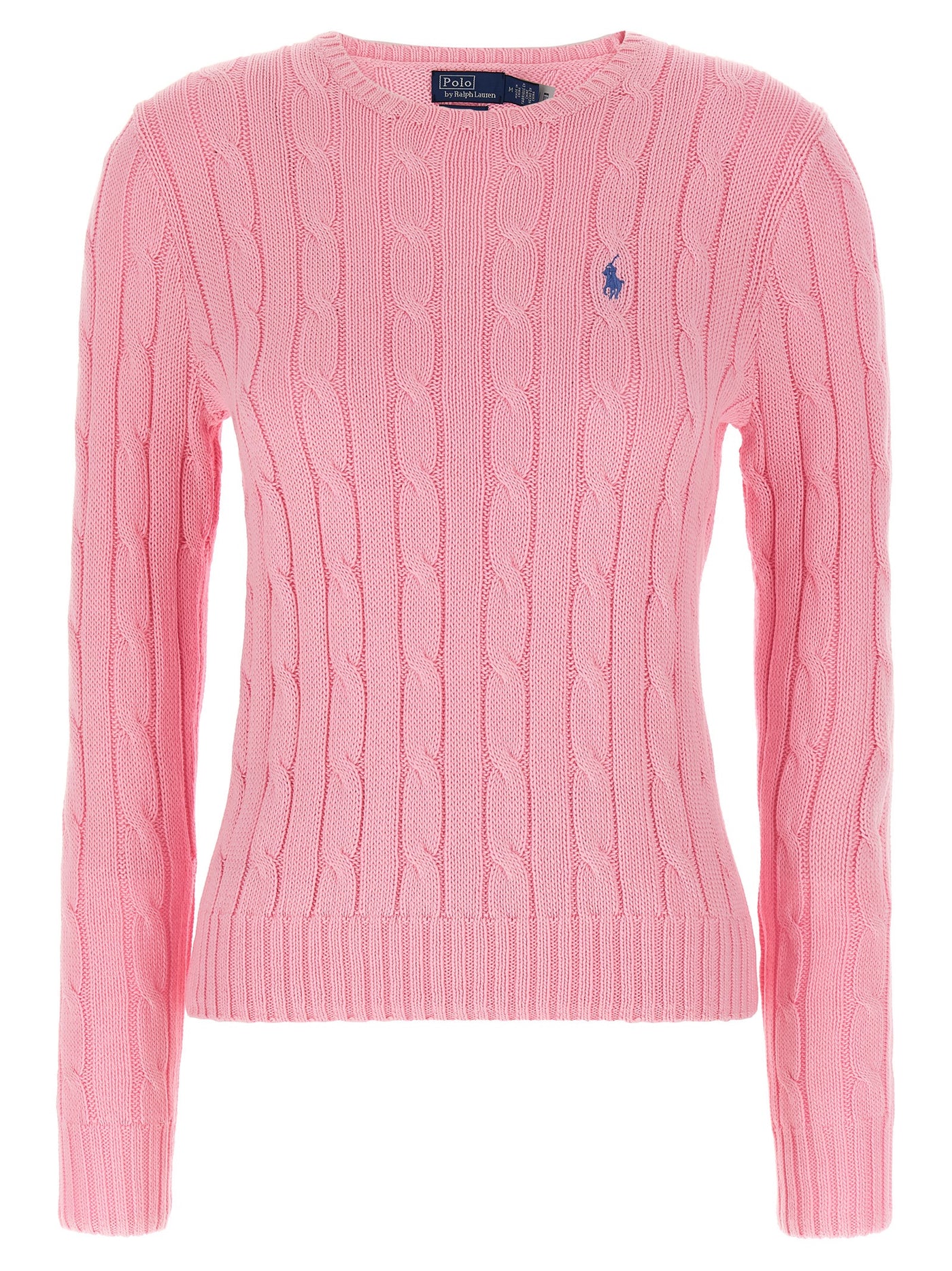 Julianna sweater in Pima cotton with cable knit, contrasting logo embroidery on the front, crew neck, long sleeves with cuffs. Size and Fit - True to size fit