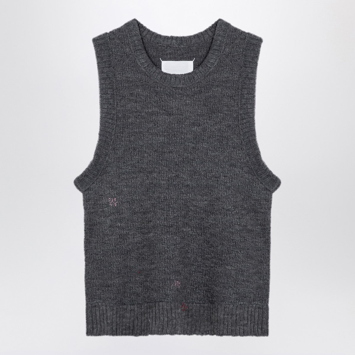 Sleeveless top by Maison Margiela in grey linen-wool blend knit featuring a round neck, ribbed elasticated edges and Four Stitches on the back. Size and Fit - Model wears size S Model measurements: Height: 180 cm Chest: 85 cm Waist: 66 cm Hips: 89 cm