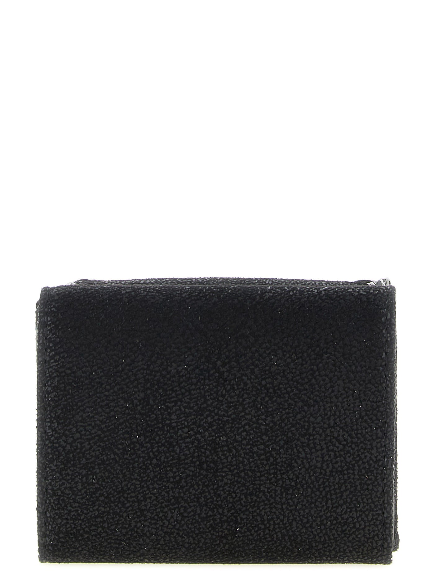 'Falabella' wallet in matt Shaggy Deer, Tri-Fold model, flap closure with snap button and diamond-effect chain detail in brass and front aluminium, monogram polyester lining, medallion charm with engraved logo. Size and Fit - W 10 x H 8 x D 4 cm