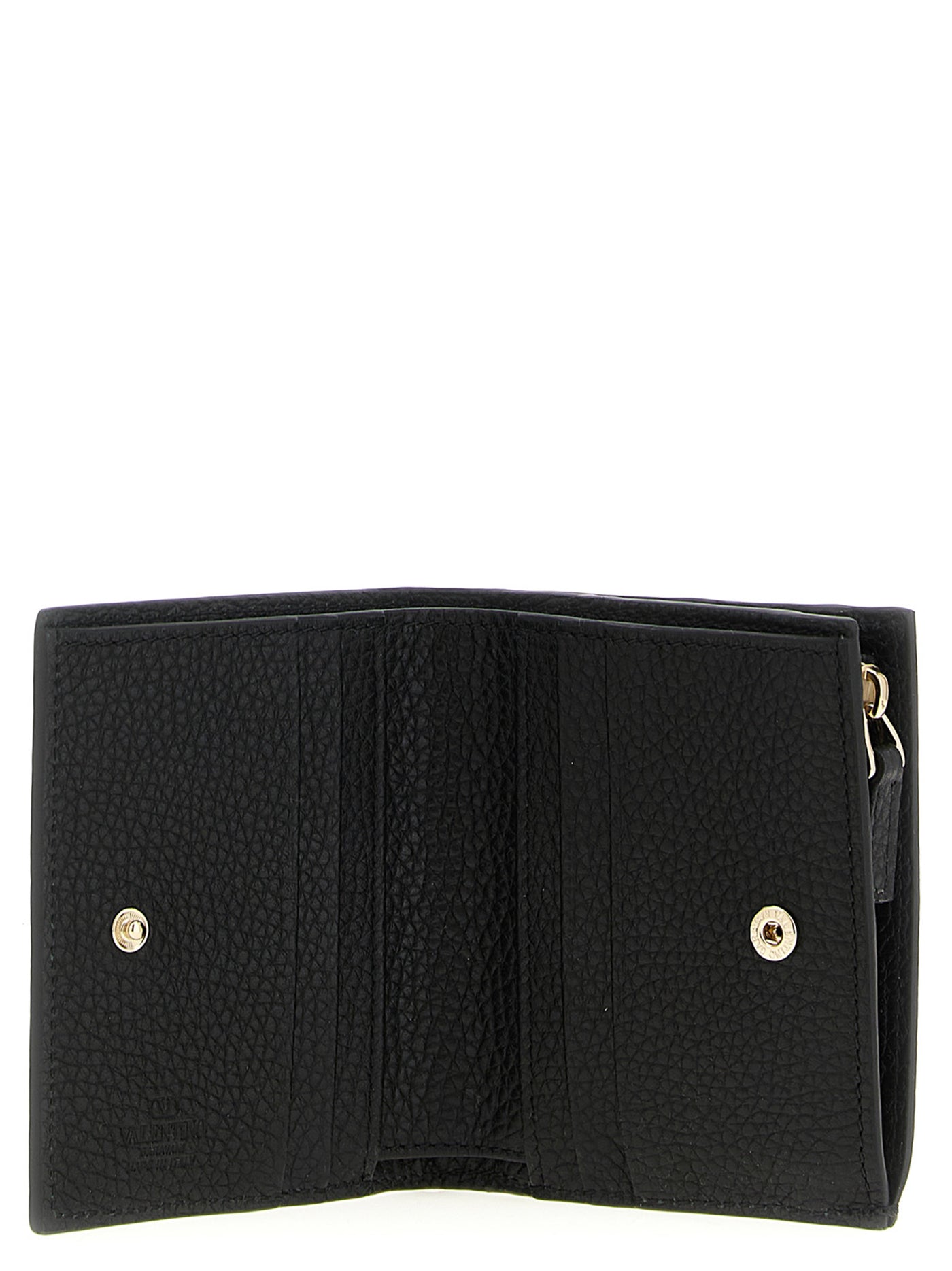 'Rockstud' garnet calf leather wallet with platinum-finish metal studs, flap closure with snap button, zip pocket. Size and Fit - W 8.3 x H 10.5 x D 2.5 cm
