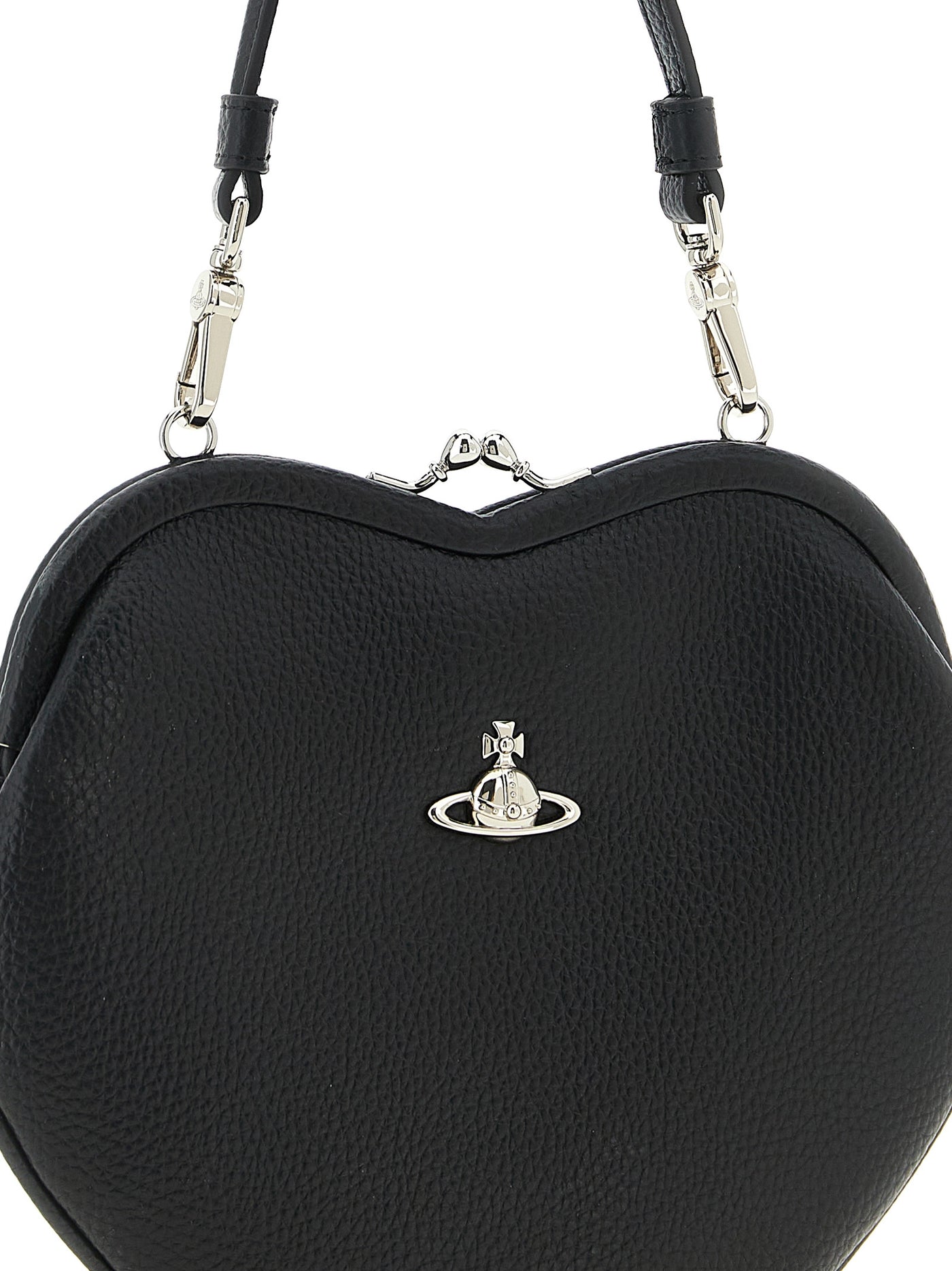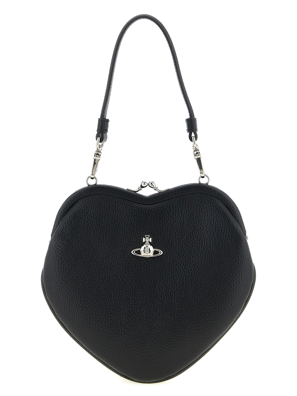 'belle heart frame' handbag in garnet leather-effect fabric, Front metal 'orb bas relief' logo, Snap closure, Removable leather-effect fabric handle, Removable chain shoulder strap. Size and Fit - W 20 x H 20 x D 4 cm