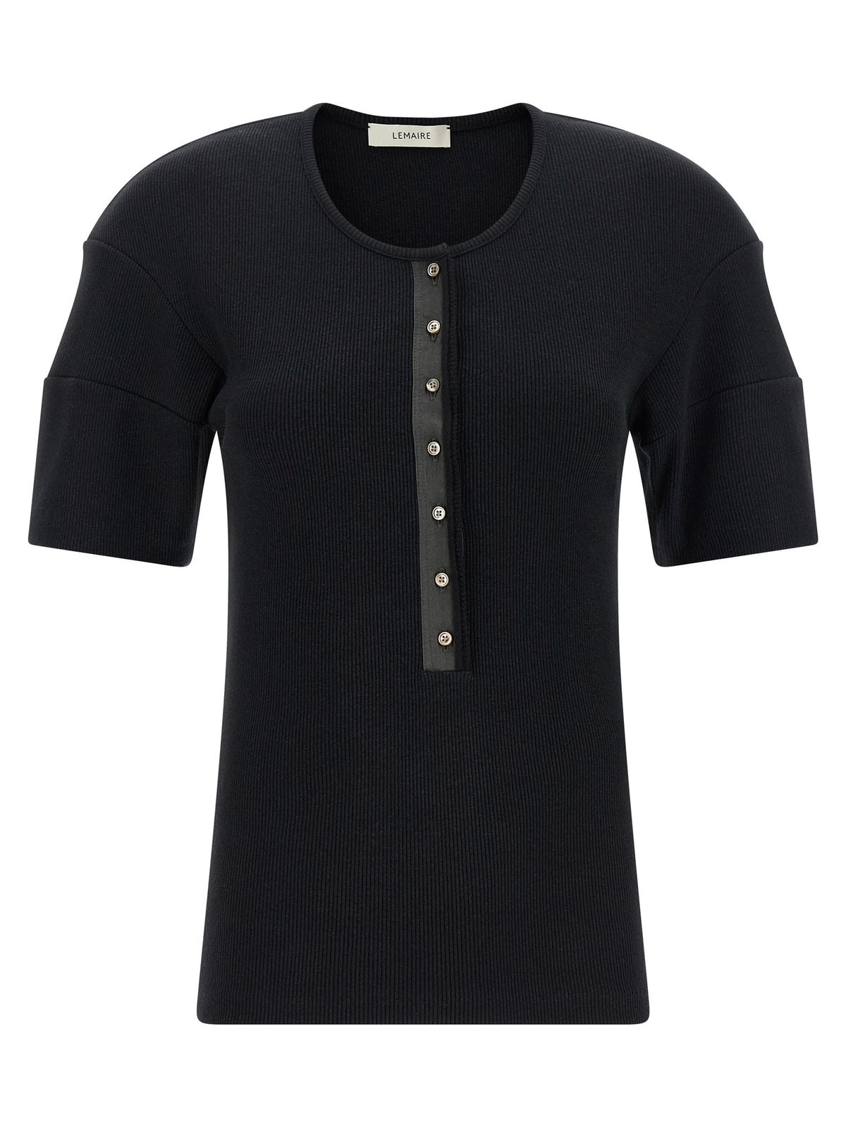 'Henley' ribbed cotton and linen jersey sweater, round neckline with mother-of-pearl button closure and contrast fabric on the front buttoning, short sleeves with 3D effect pleats. Size and Fit - true to size fit