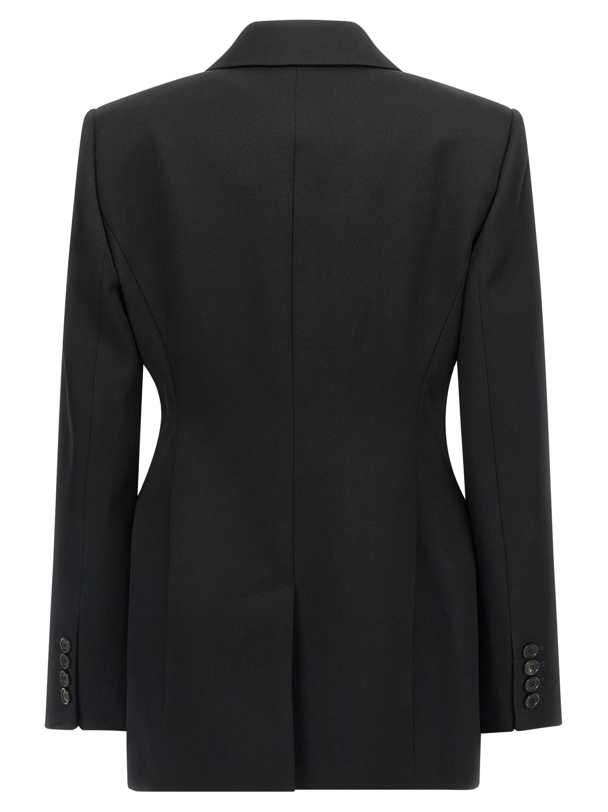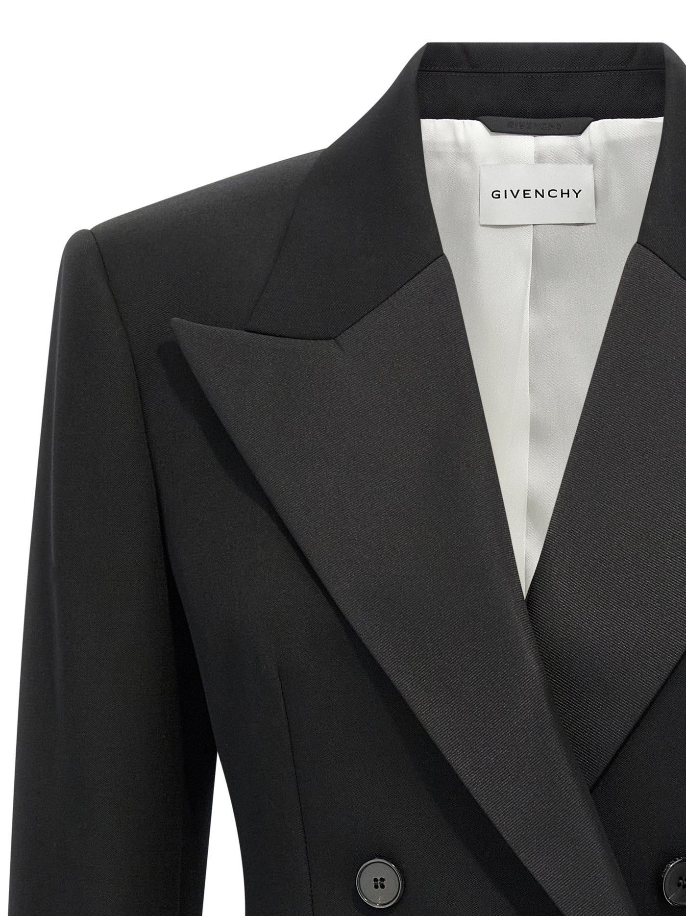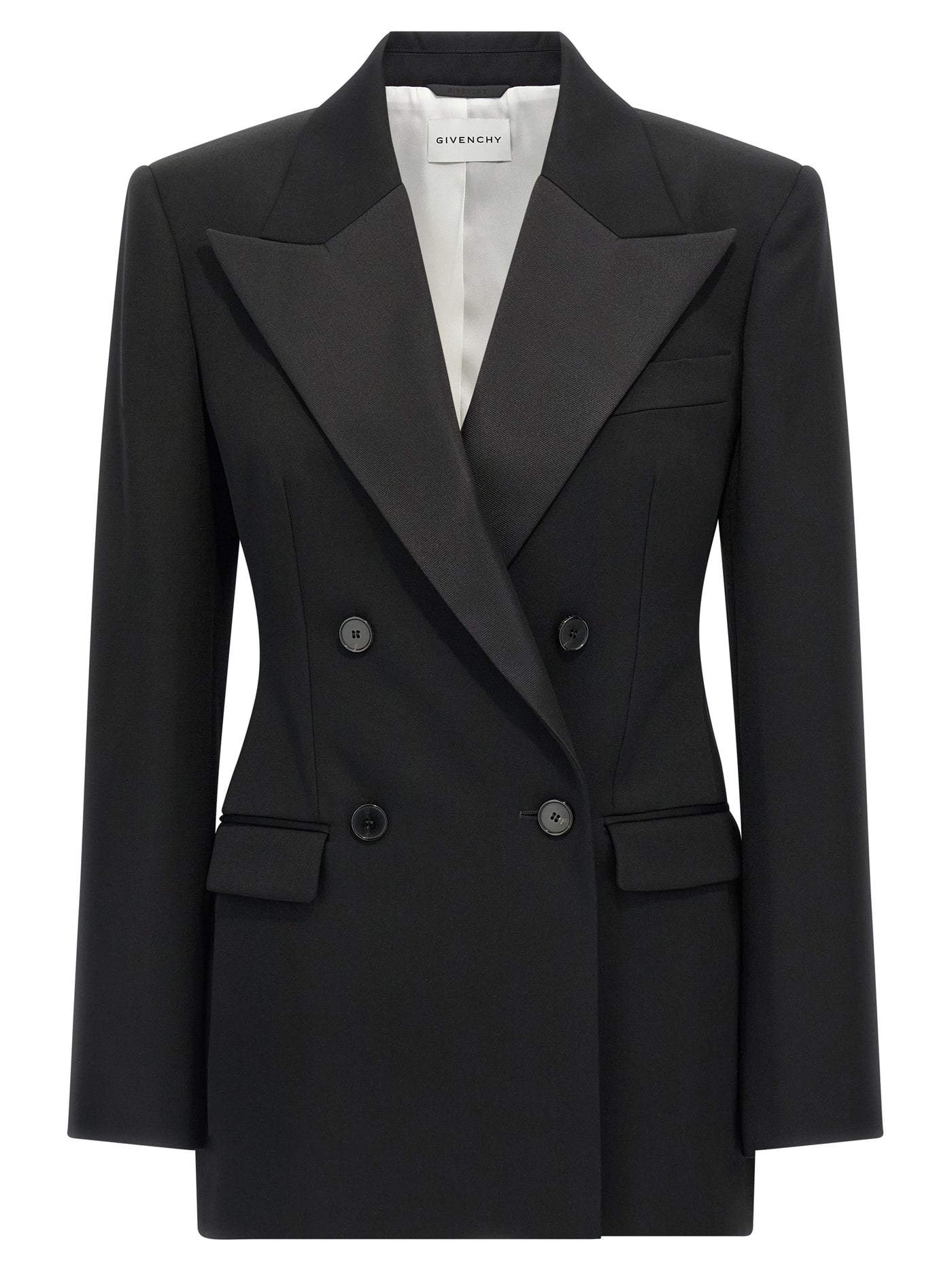 Double-breasted grain de poudre wool blazer with front button closure, hourglass silhouette, tone-on-tone satin peak lapels, breast pocket, flap pockets, padded shoulders, long sleeves, back split, contrast satin lining. Size and Fit - true to size fit - FRENCH size