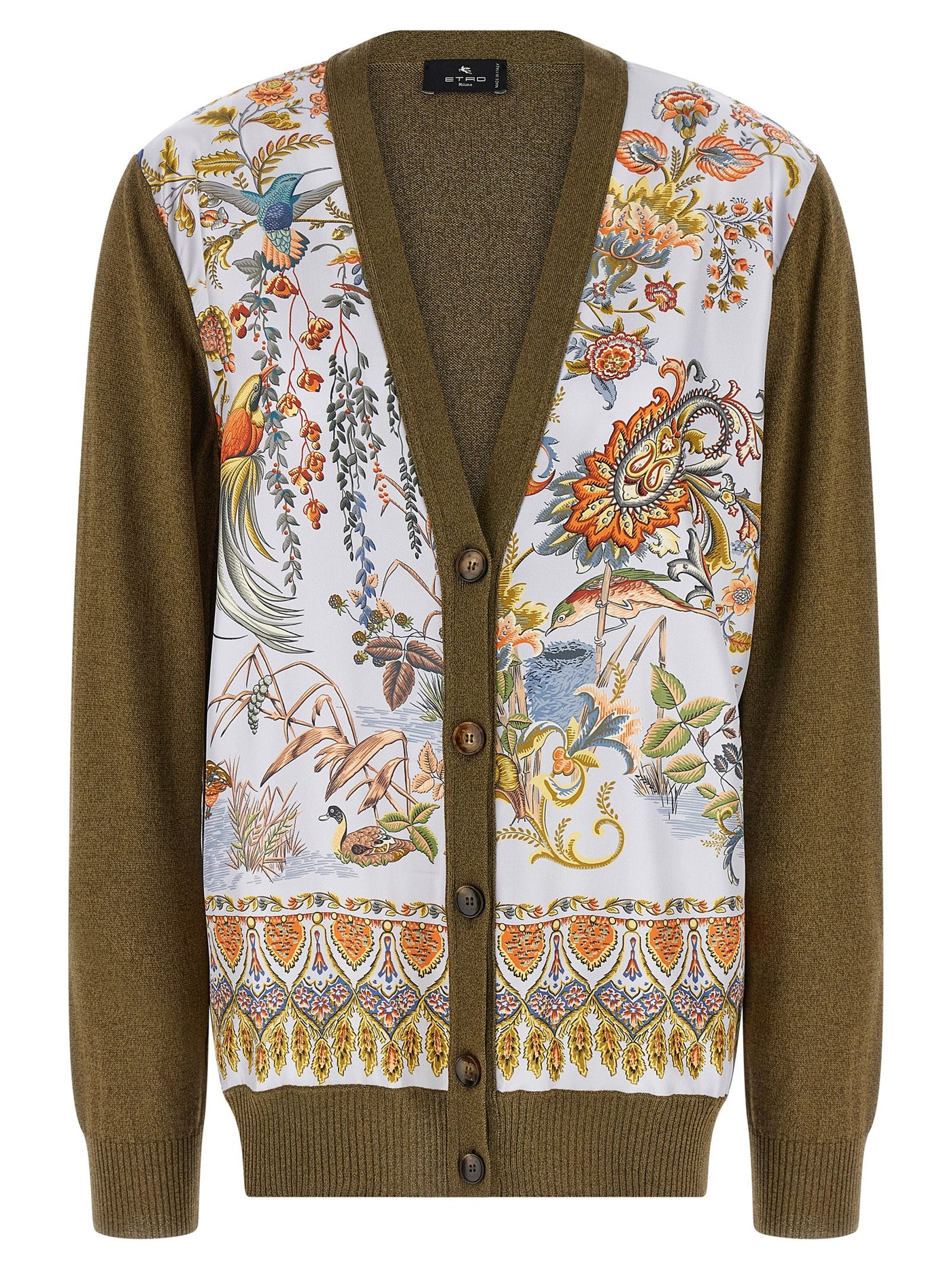 Cardigan in cotton blend and solid color viscose with silk insert paisley foliage pattern on the front, V-neck, Button closure, Long cuffed sleeves, Band on the hem. Size and Fit - true to size fit