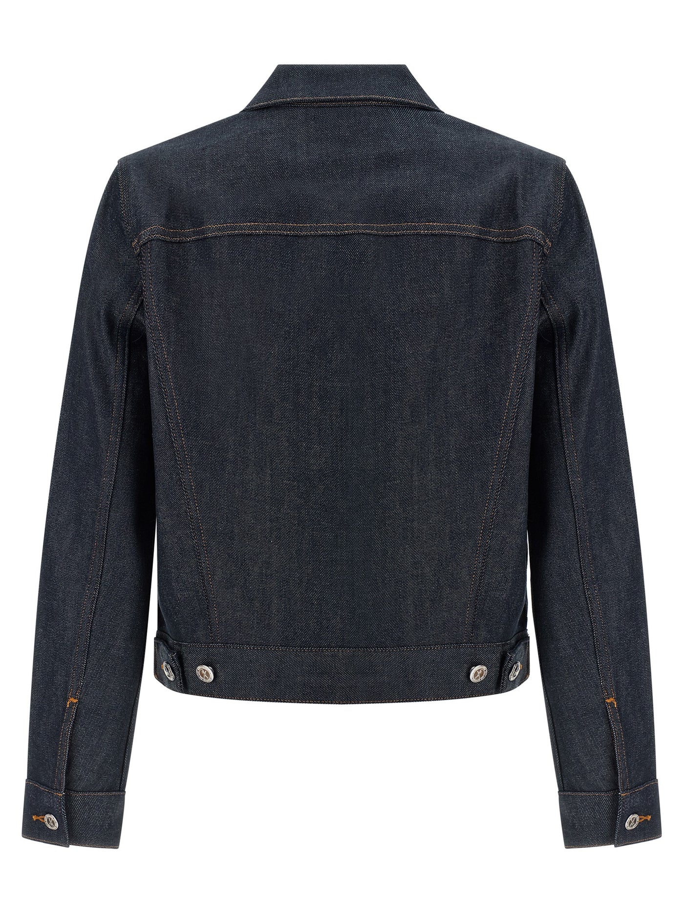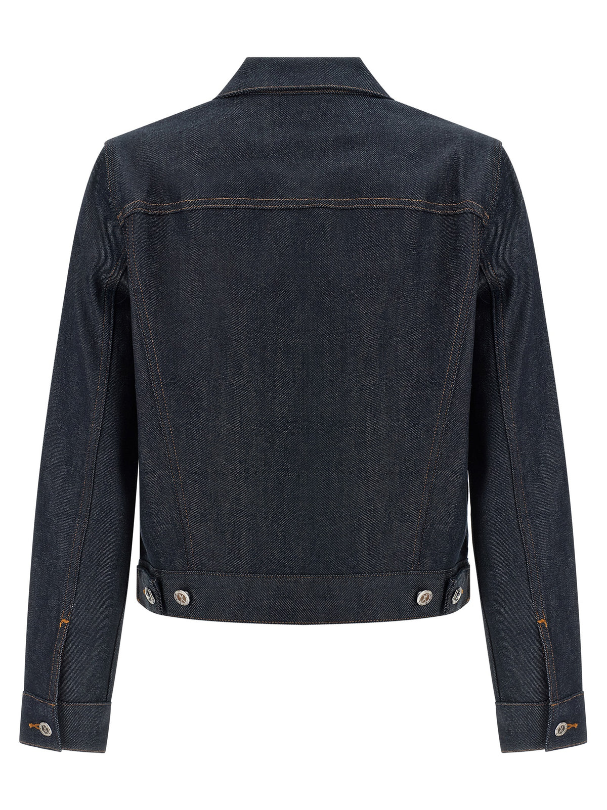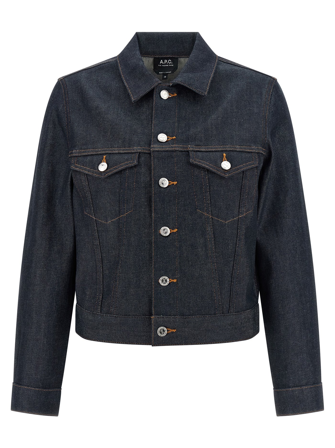 'Dion' jacket in Japanese raw denim with contrast stitching, slightly crop style, shirt collar, front button closure, pockets, long cuffed sleeves. Size and Fit - true to size fit - FRENCH size