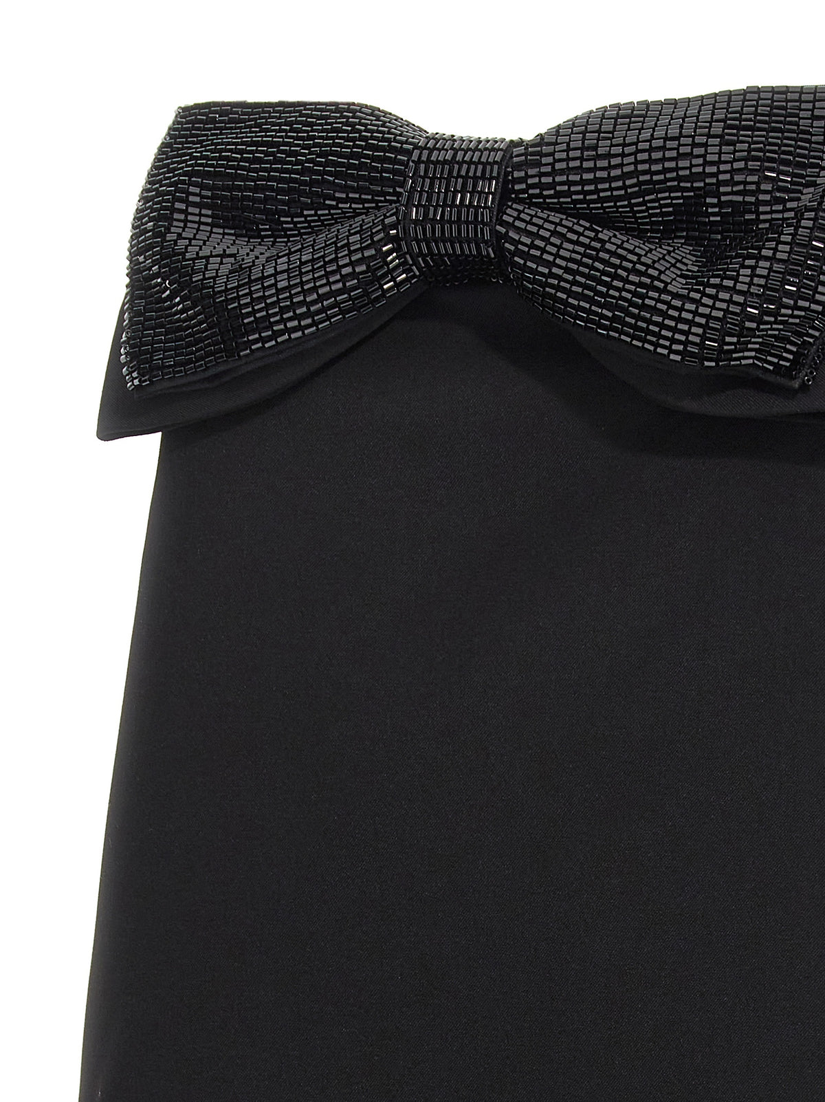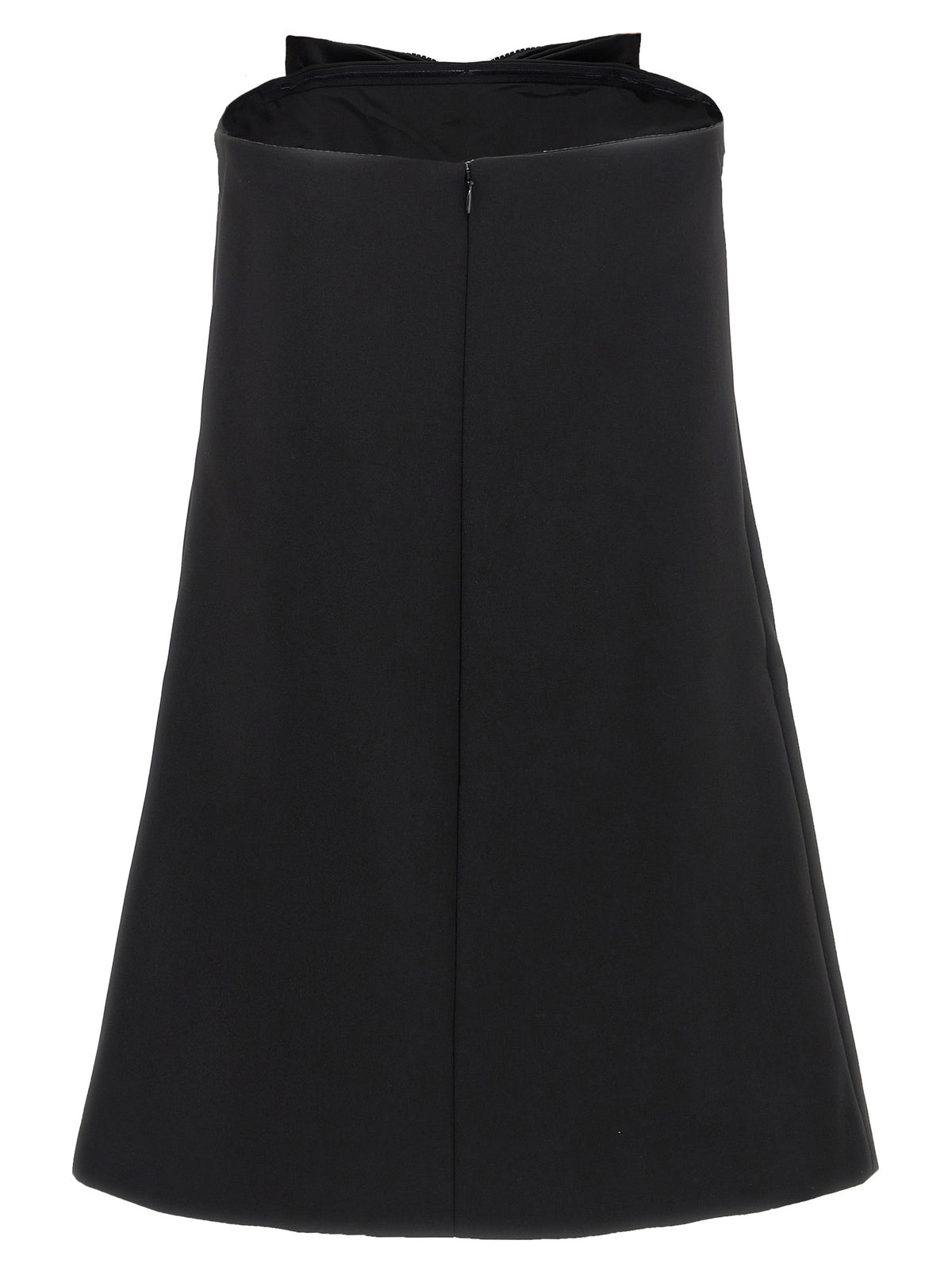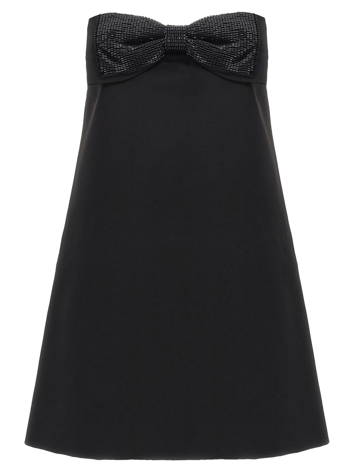 Black Crepe Bandeau Mini' crêpe dress with bow appliqué with front beads, off-the-shoulder style with corset, and back zip closure. Size and Fit - true to size fit