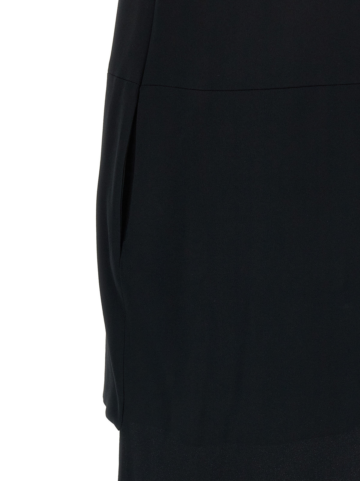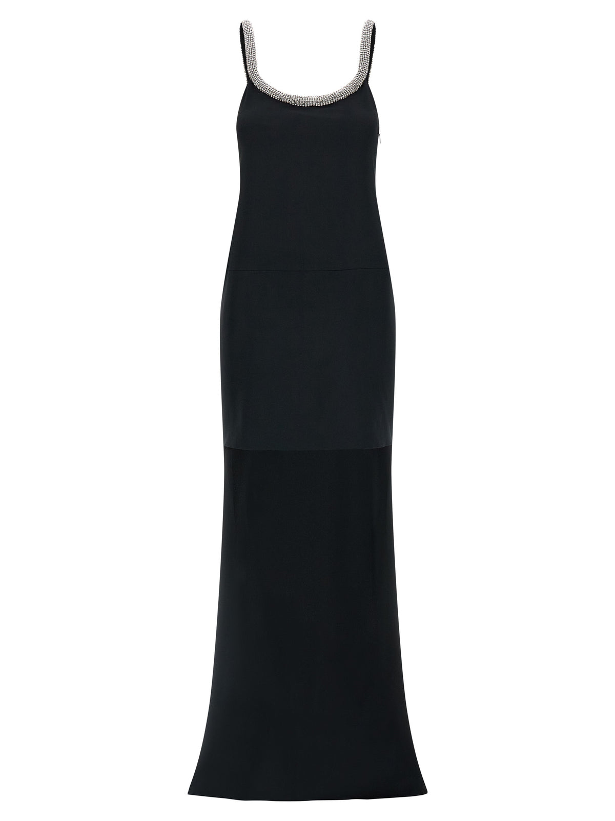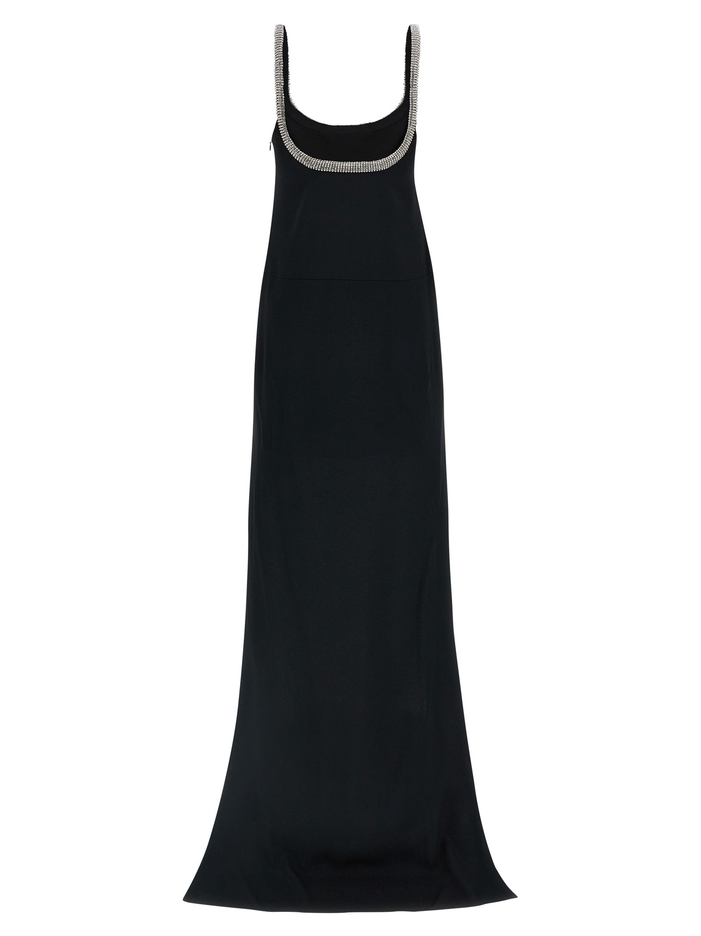 Crêpe satin dress with asymmetrical hem and long train, wide round neckline at the front and back embellished with crystal braces, sleeveless, side zip closure, pockets. Size and Fit - true to size fit