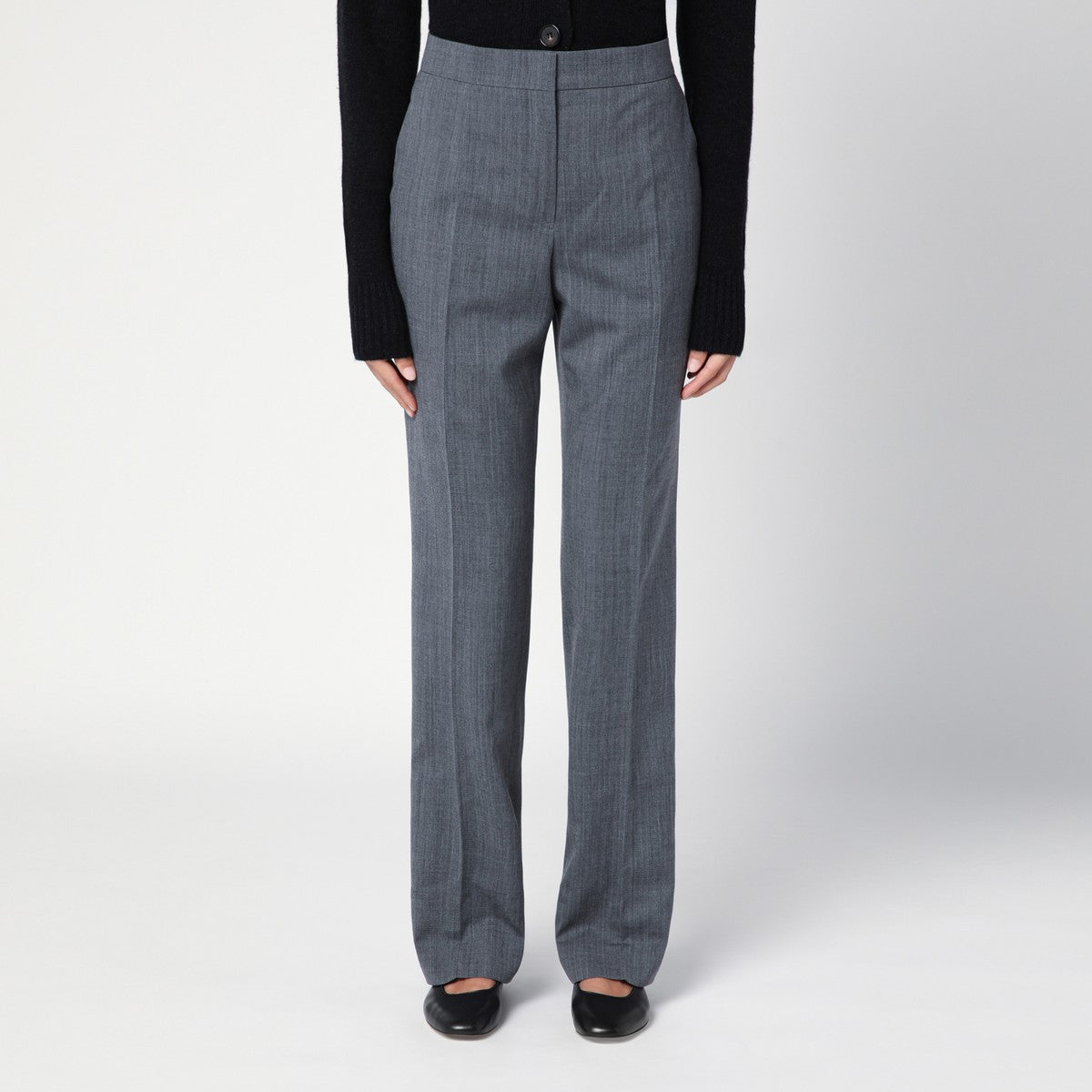 Grey wool Jil Sander trousers featuring a front fastening, two back welt pockets, a high waist, front darts and back slits. Size and Fit - Model wears size 36 FR Model measurements: Height: 179 cm Chest: 82 cm Waist: 65 cm Hips: 90 cm