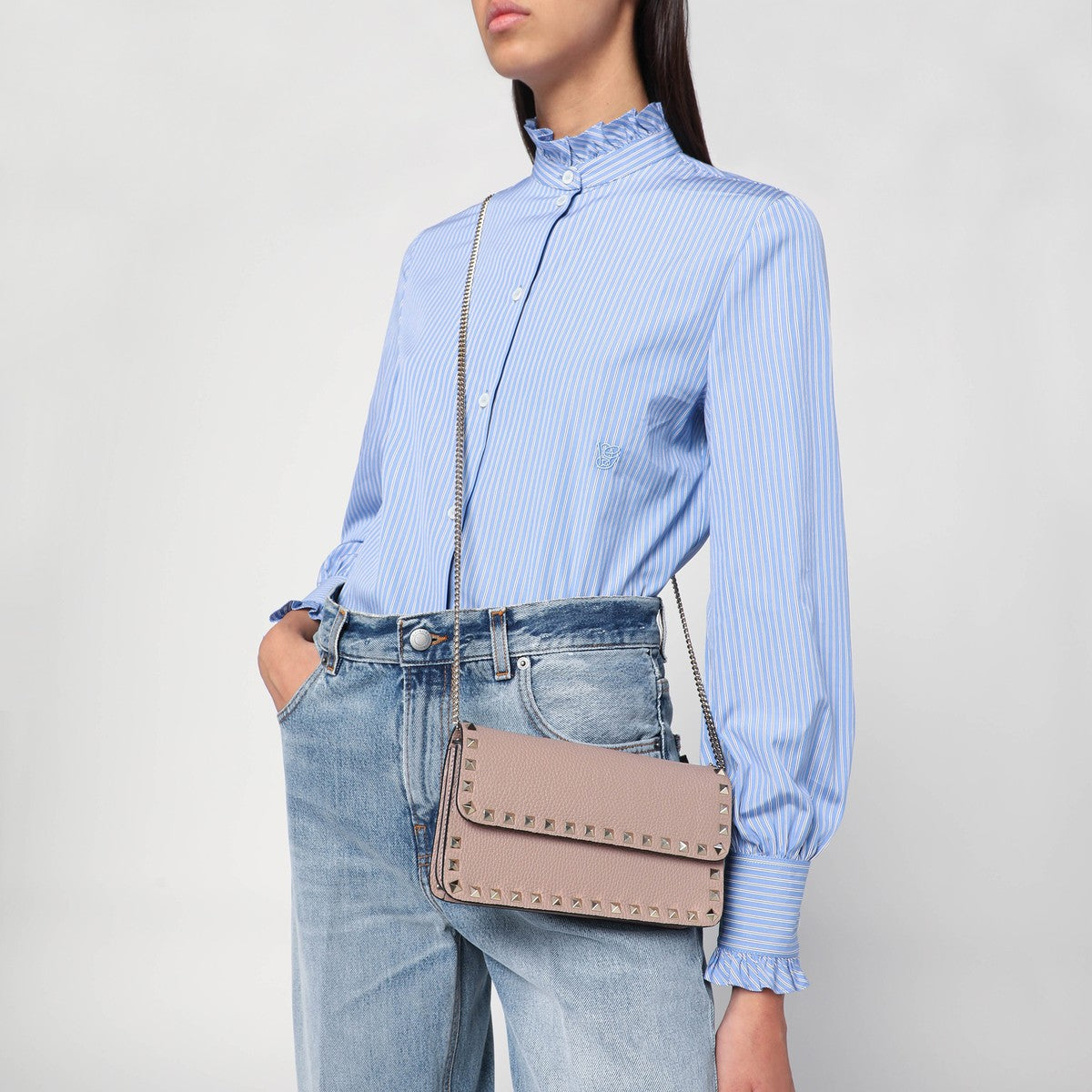 Garnet-coloured calf leather chain wallet by Valentino Garavani features a detachable chain, decorative studs, gold-coloured metal hardware, a magnetic button fastening, a zip pocket under the flap and three internal card slots. Size and Fit - Width 21 cm x Height 11 cm x Depth 4 cm Shoulder strap length 114 cm
