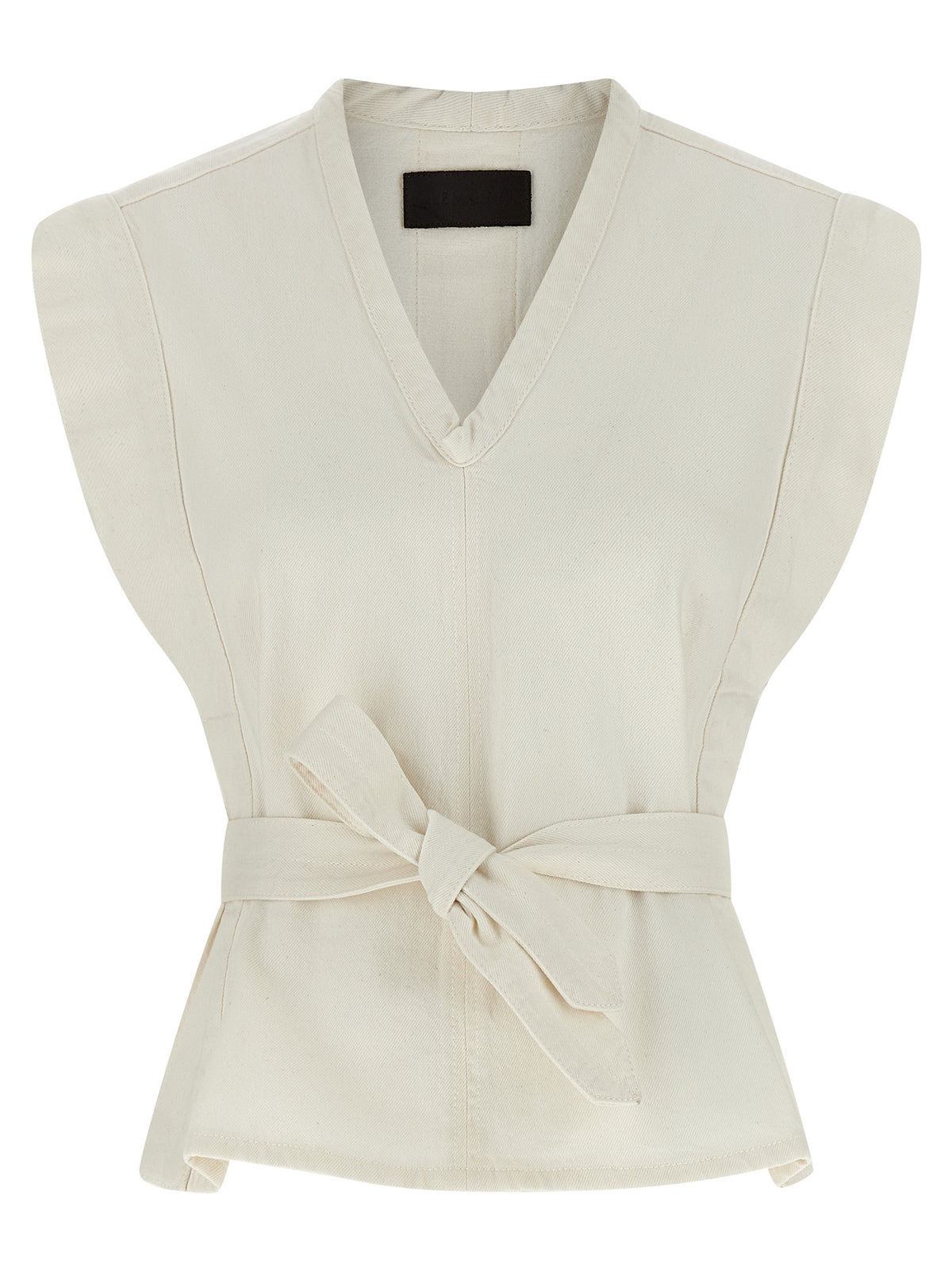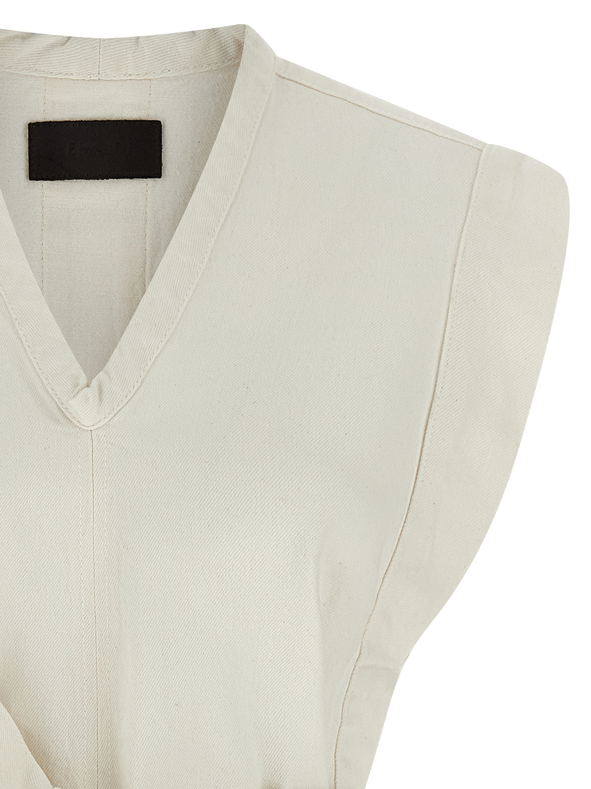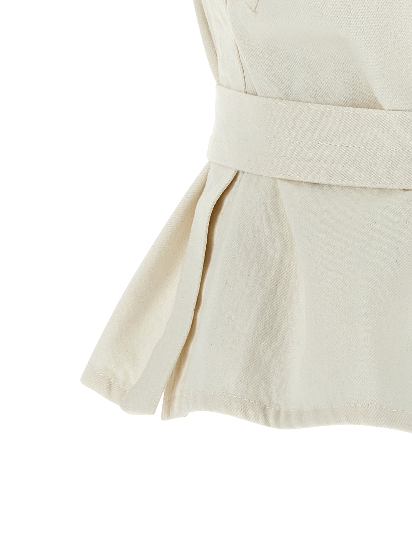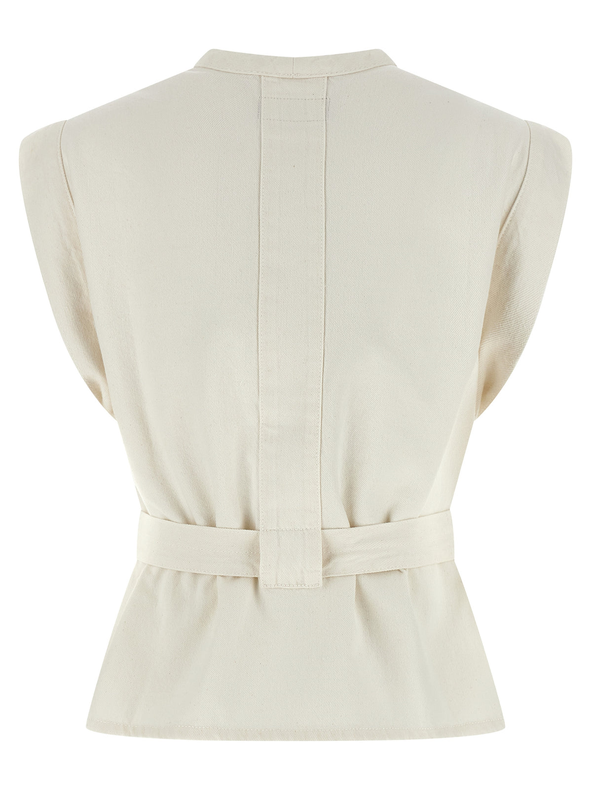 Chasuble' denim vest with exposed twill texture and intense wash, Contrast stitching, V-neck, Wide armholes, Side slits, Removable matching belt. Size and Fit - Boxy fit - lemaire size
