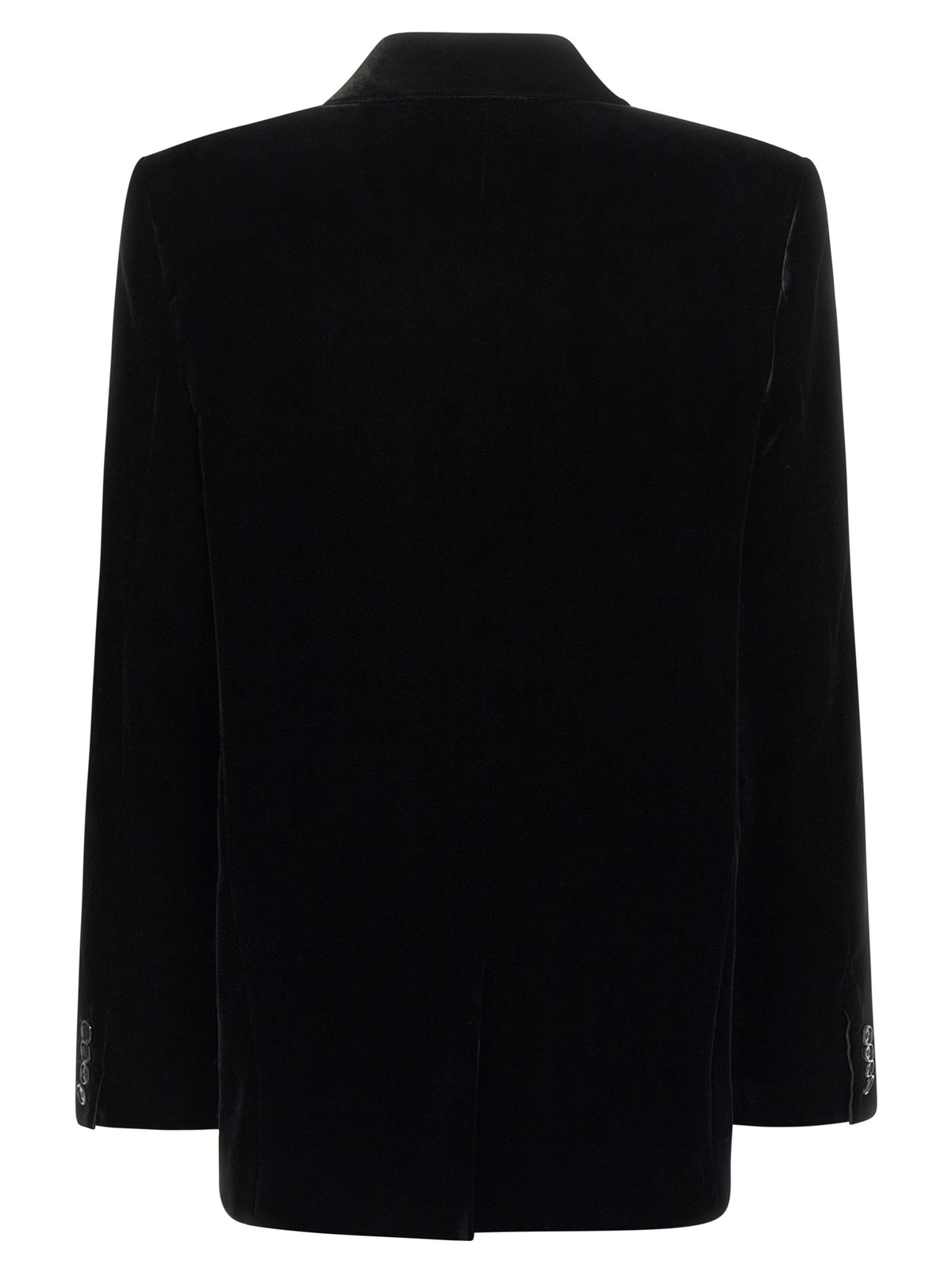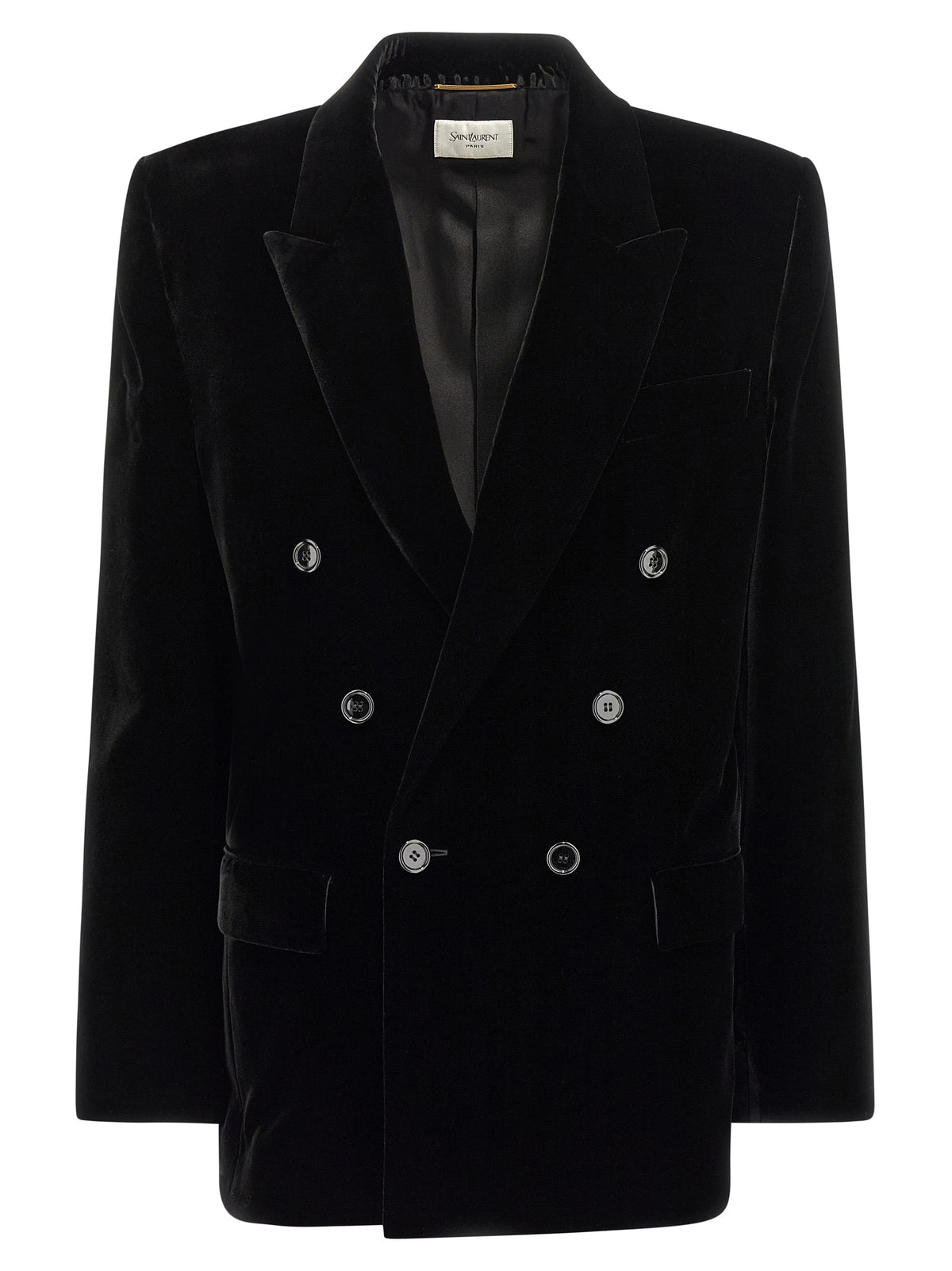 Double-breasted viscose velvet and cupro blazer with front button closure, peak lapels, chest pocket, flap pockets, inside pocket with tone-on-tone 'Cassandre' embroidery, padded shoulder, long sleeves, back split, and silk lining. Size and Fit - true to size fit - FRENCH size