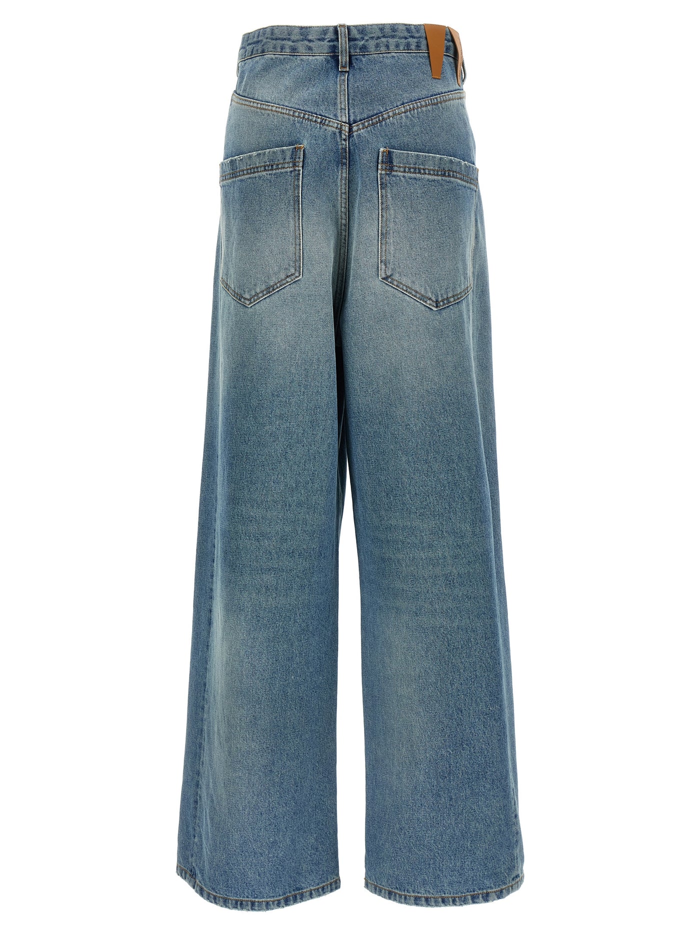 'Ines' stonewashed cotton denim jeans, zip and button closure with front crossed flap, contrast stitching, low waist, low crotch, wide and long leg with curved stitching, five pockets, back logo tag. Size and Fit - Comfort fit