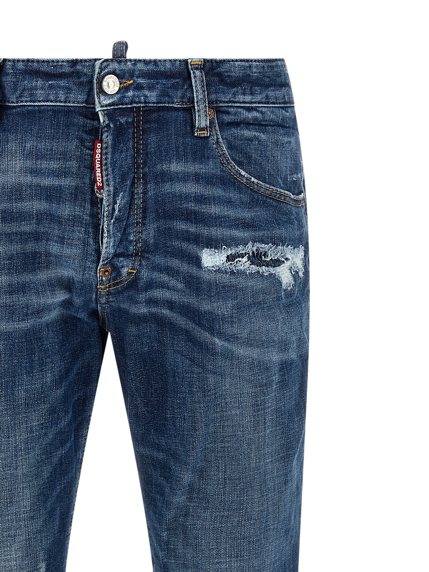 'Skater' cotton denim jeans with used-effect details and small patches, contrast stitching, low waist, five pockets, front button closure, back leather logo tag. Size and Fit - true to size fit
