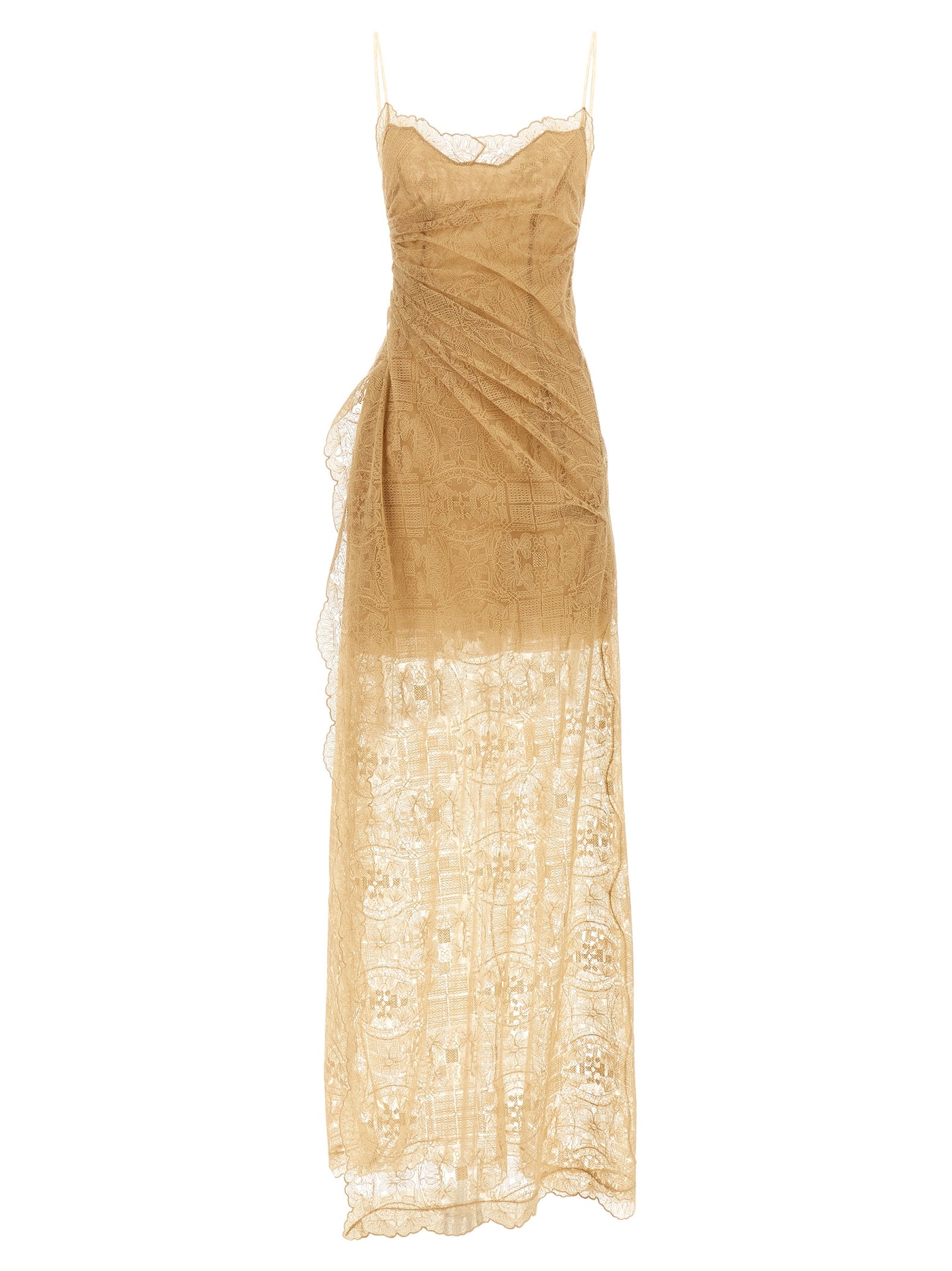 Long dress with all-over majolica embroidery, Semi-transparent, Sheath dress with thin straps, Curling on the sides, Back closure with hidden zip. Size and Fit - True to size fit