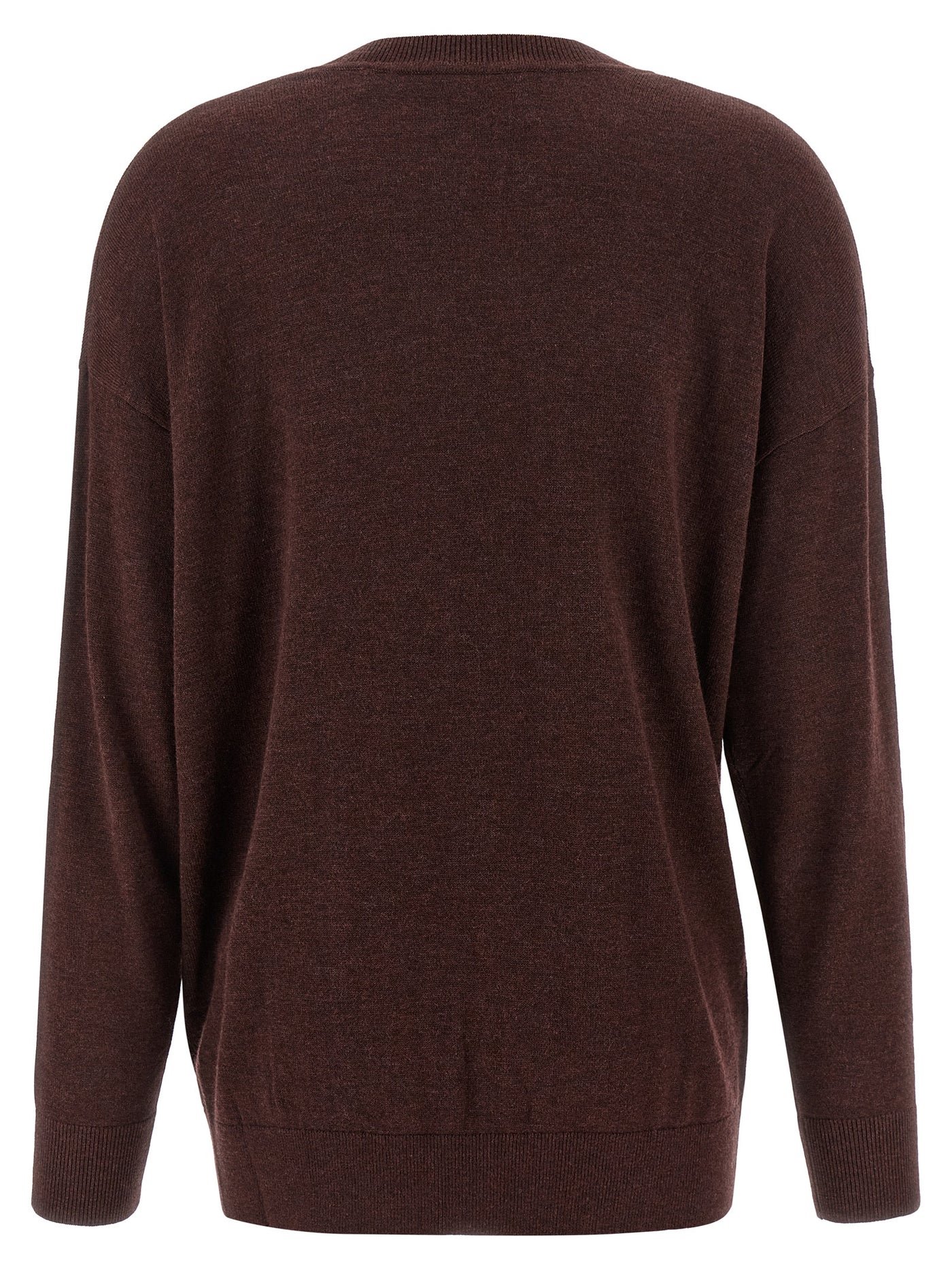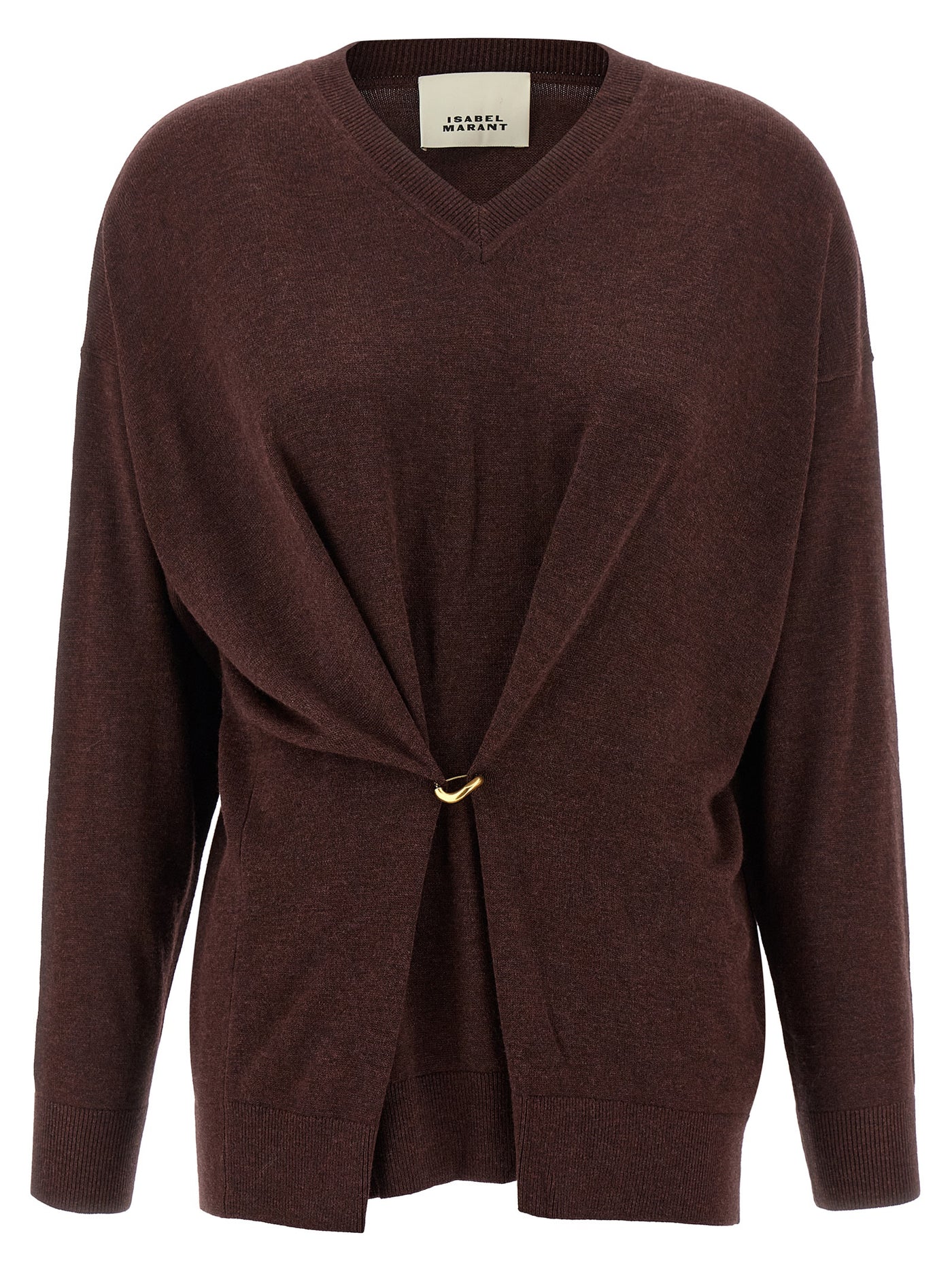 'Chiraz' viscose and wool sweater, removable metal brooch detail on the front, V-neck, long sleeves with cuffs and dropped shoulders. Size and Fit - oversize fit - FRENCH size
