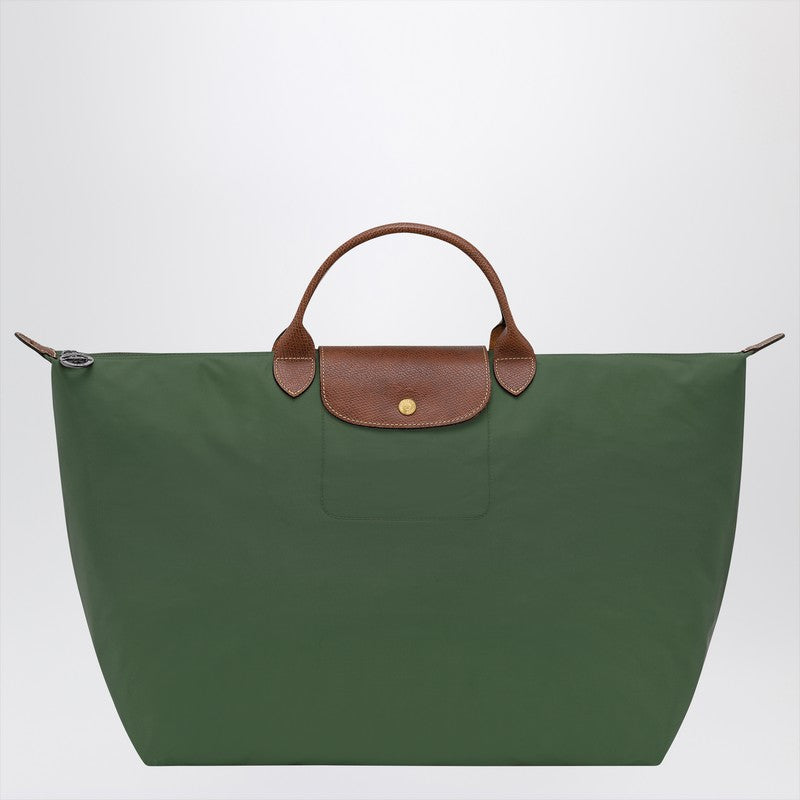 Small bag by Longchamp made of green recycled polyamide canvas with brown leather details, featuring two top handles, book closure with magnetic clasp, zip fastening and main compartment. Size and Fit - Width 24 cm x Height 17 cm x Depth 11,5 cm Adjustable shoulder strap length min 50 cm - max 100 cm Handle drop: 10 cm