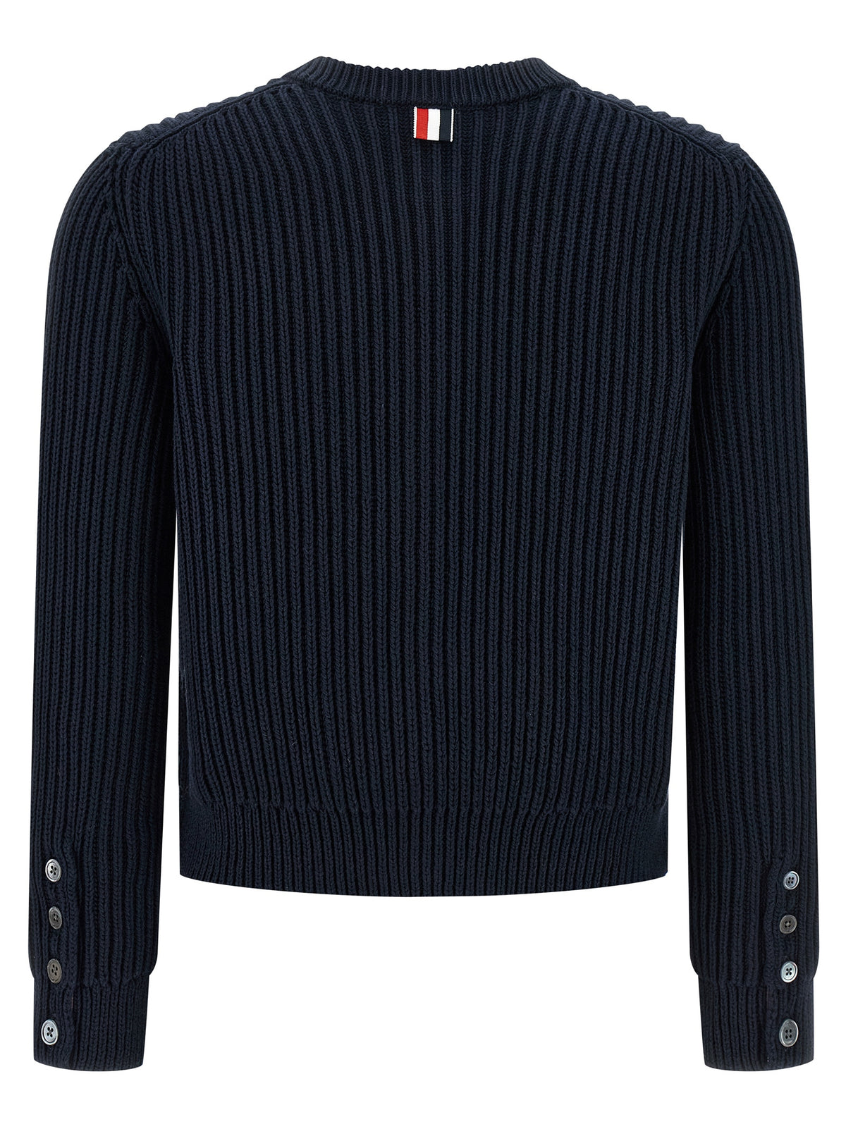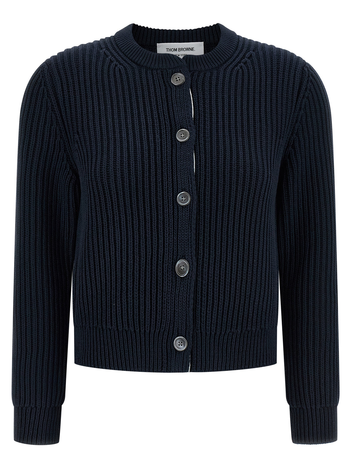 Knitted cotton cardigan, crop model, crew neck, front button closure with RWB grosgrain tape lining, long cuffed sleeves. Size and Fit - true to size fit