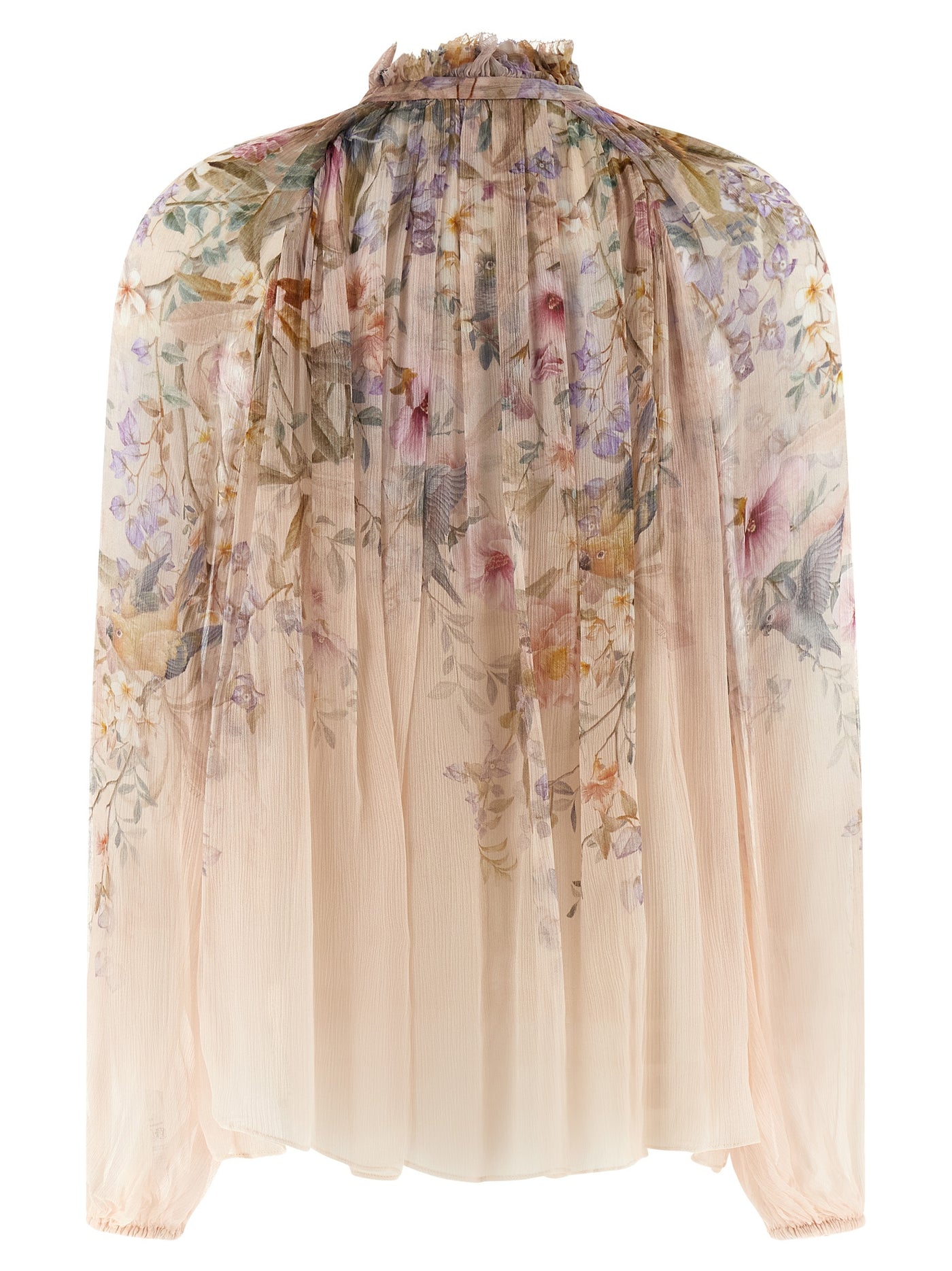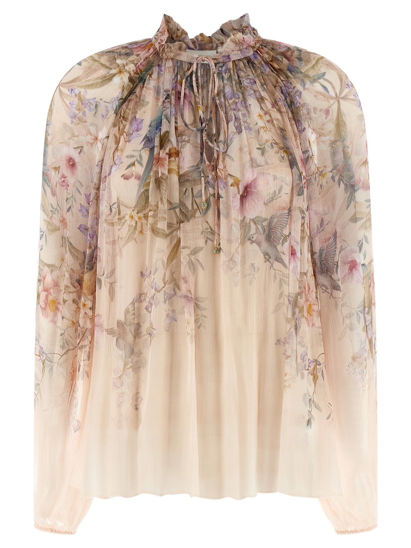 'billow rebellion' blouse in 'aviary' patterned curled viscose, Raised collar with ruffles, V-neck with tie cord, Long puff sleeves with elastic cuffs, Removable top._x000d_